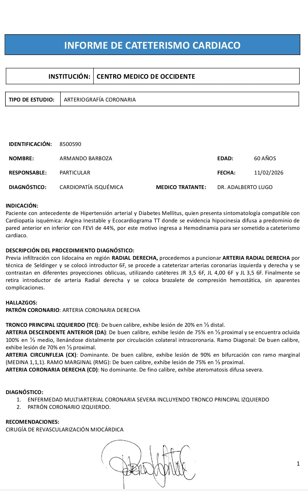 Tras presentar diversos malestares, mi padre fue evaluado por un especialista en cardiología, quien indicó la realización de estudios diagnósticos. Gracias a un gran esfuerzo familiar, logramos recaudar los fondos para realizarle un cateterismo; sin embargo, durante el procedimiento, los médicos informaron que no fue posible colocar un stent por el estado de las arterias y la única solución viable es una revascularización coronaria con caracter de urgencia para garantizar su vida.