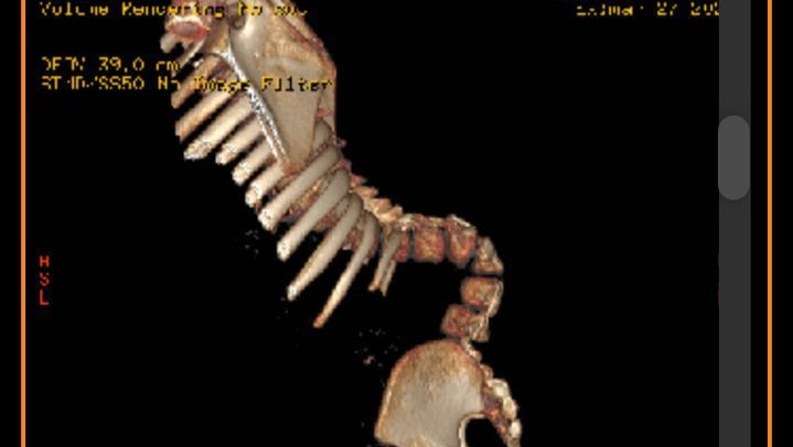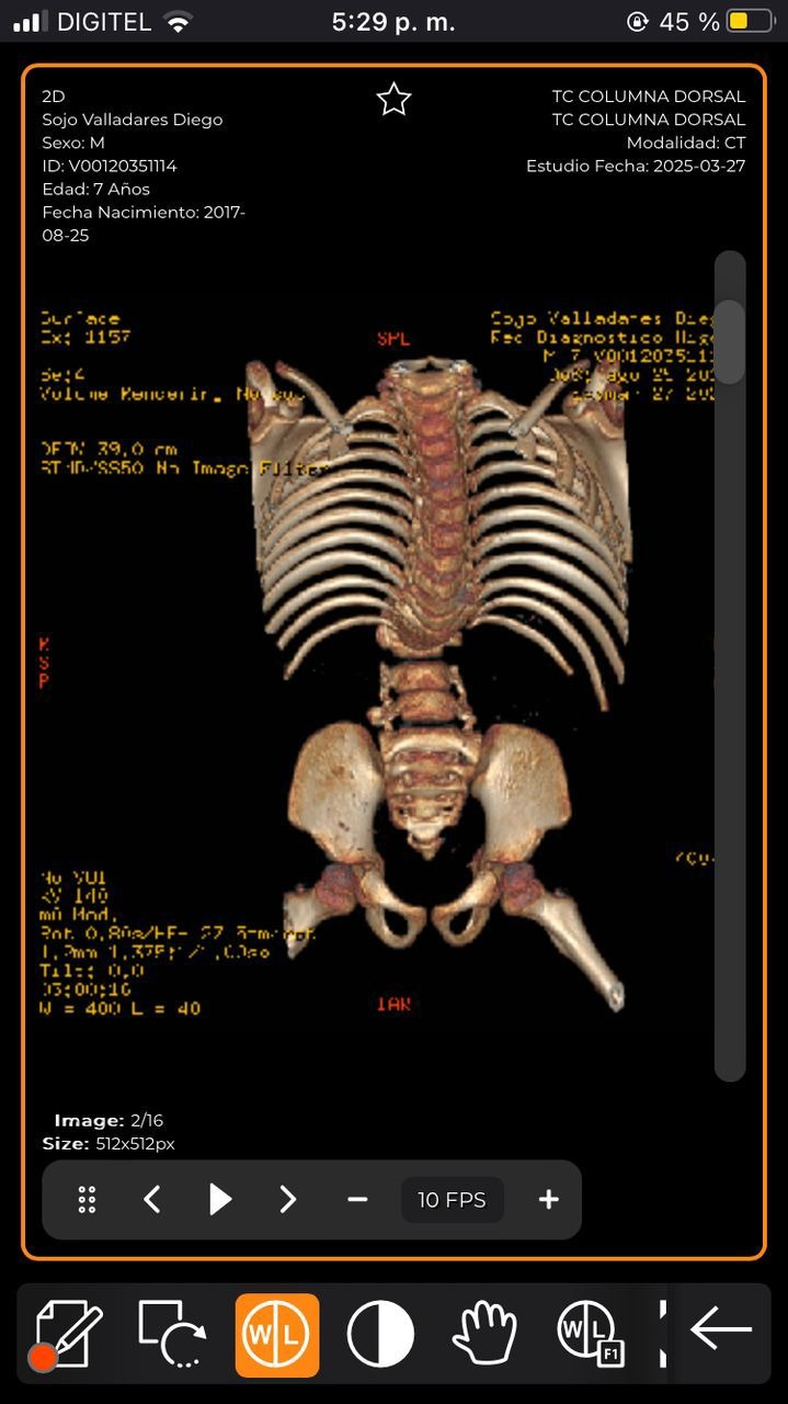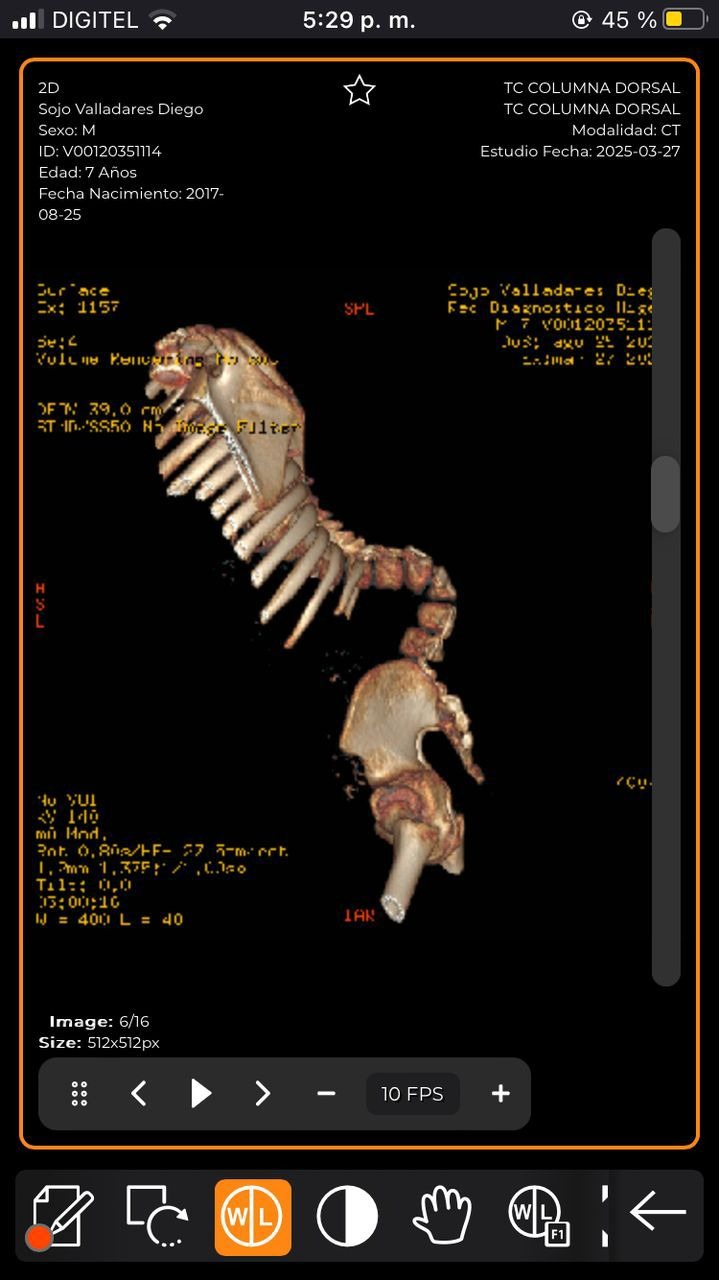 A raíz de la Espina Bífida, su columna desarrolló una CIFOSIS MIELODISPLASICA, generando una curvatura de gran magnitud, que solo puede ser corregida quirurgicamente con el siguiente procedimiento: RIZOTOMIAS BILATERALES, RETIRO DE CUERPOS VERTEBRALES L2 y L3 Y ARTRODESIS VERTEBRAL de T4 a S1 con tornillos, alambres y barras.
