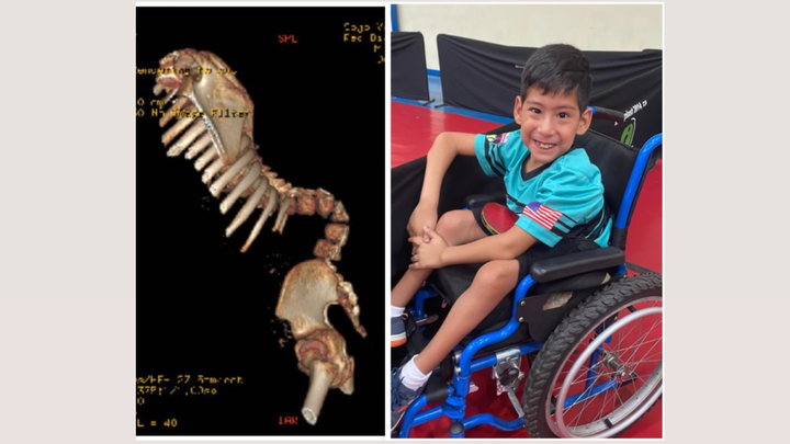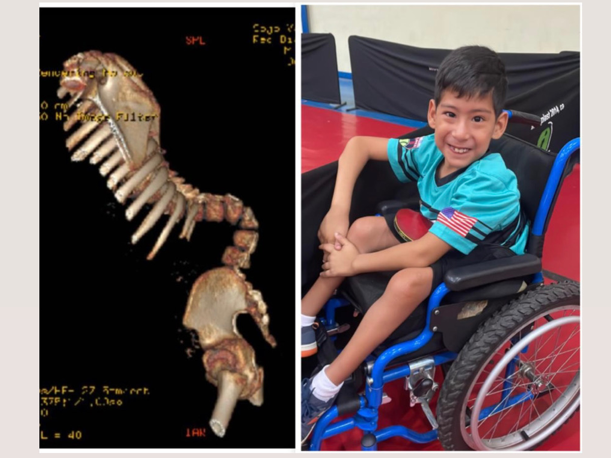As a result of Spina Bifida, his spine developed a condition called MYELODYSPLASTIC KYPHOSIS, causing a severe curvature that can only be corrected through a complex surgical procedure involving: bilateral rhizotomies, removal of vertebral bodies L2 and L3, and spinal fusion from T4 to S1 using screws, wires, and rods.