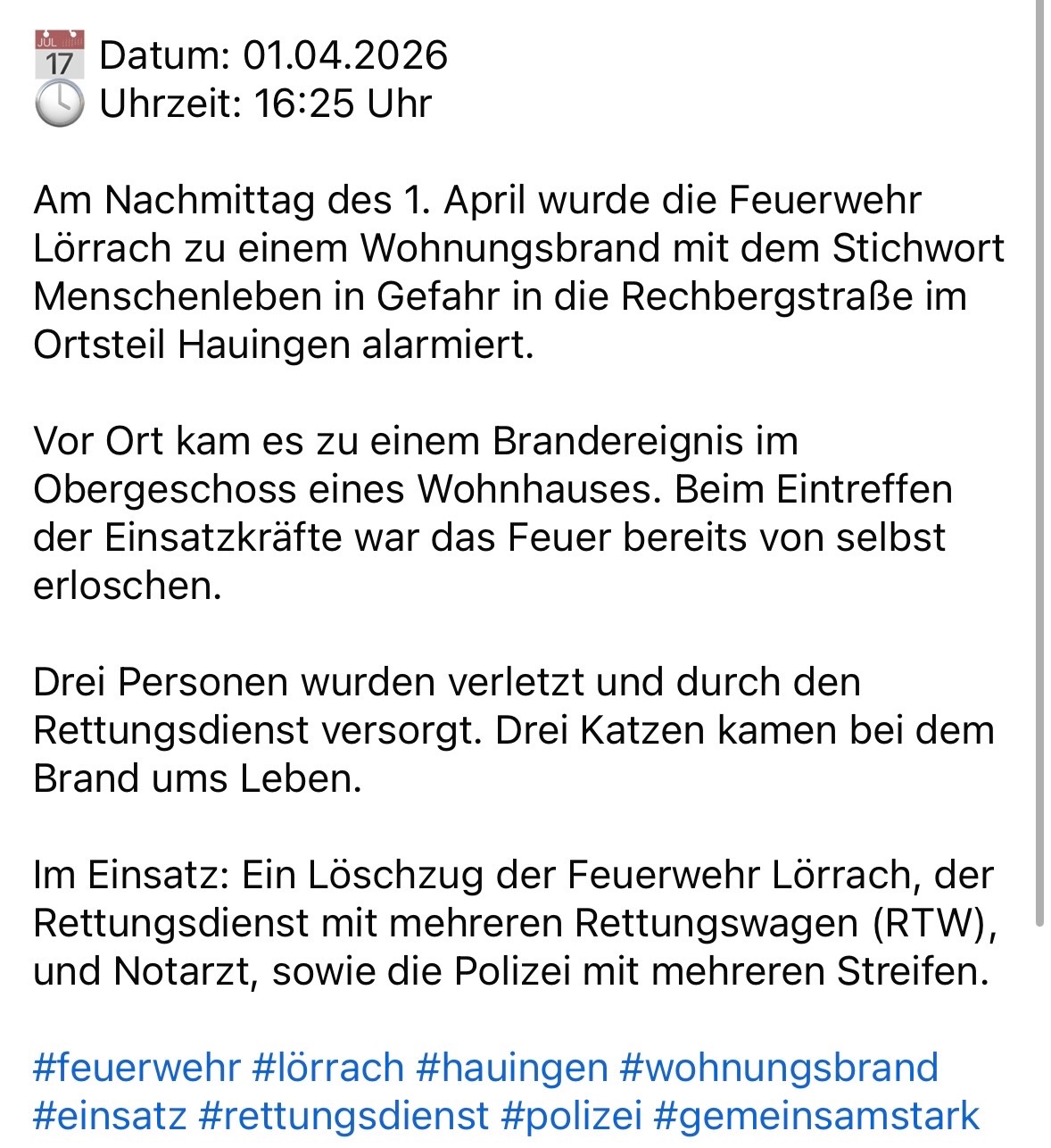 Gestern, am 01.04.26 hat es bei Diana und Maren gebrannt. Dabei haben sie nicht nur ihre 3 geliebten Katzen verloren zudem ist die Wohnung nicht bewohnbar und all ihr hab und Gut zerstört.