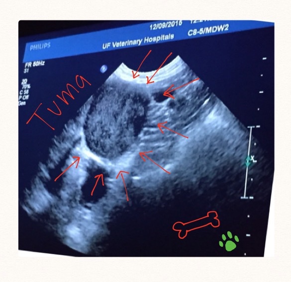 One day, on “Bring your doggy to work day" they figured it out! At the UF Vegetenarian school they gave me a tummy massage with an ultrasound. It was nice. But, when they finished my mom was really sad. I tried to cheer her up by giving her kisses and wiggling my bum, but that didn’t help like it usually does.The doctors say I have a Pheochromocytoma, or how the great Schwarzenegger says, “It’s a Tuma.” It is in my left adrenal gland, the tiny organ that secretes adrenaline. They say surgery is difficult but will cure me!! The only problem is that the surgery is very expensive: $4,000-5000!!!