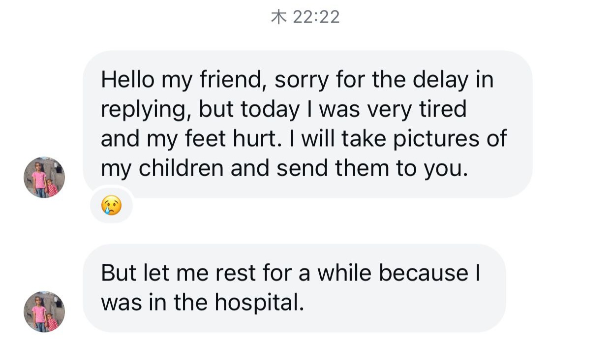 We tried to have a video call multiple times, but kept missing each other due to the time zone. However, he took the below photos of his daughter with a sign that reads "Hello Ayaki" (my name) as a way to verify his identity. I'm sorry if the idea seems crude, but given the difficulties in connecting, we had to get creative, especially since I know his biggest hurdle right now is in proving that he is "real" online.