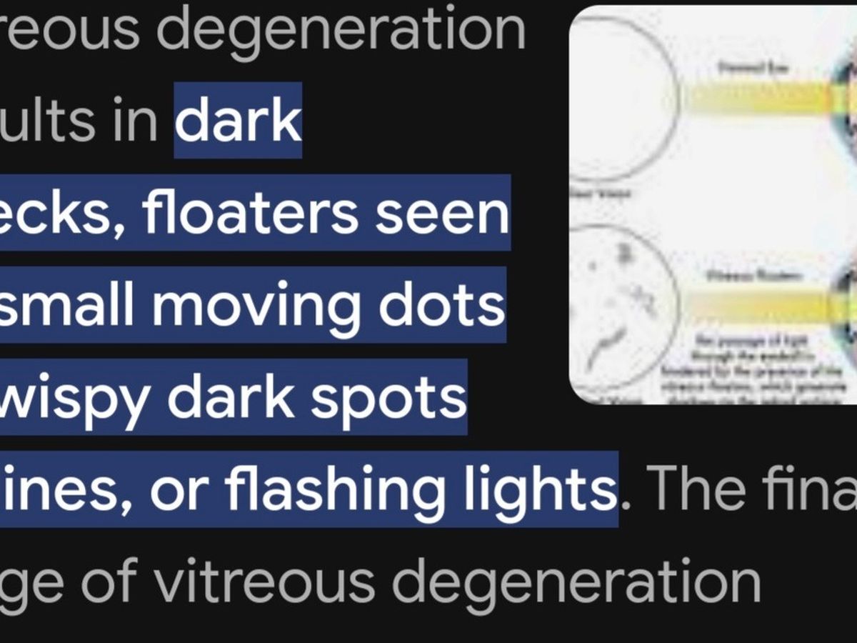 "Vitreous degeneration is a natural aging process where the vitreous humor, the clear gel-like substance in the eye, becomes more liquid and shrinks. This change can cause floaters and flashes of light, and in some cases, can lead to a posterior vitreous detachment (PVD). Here's a more detailed explanation: