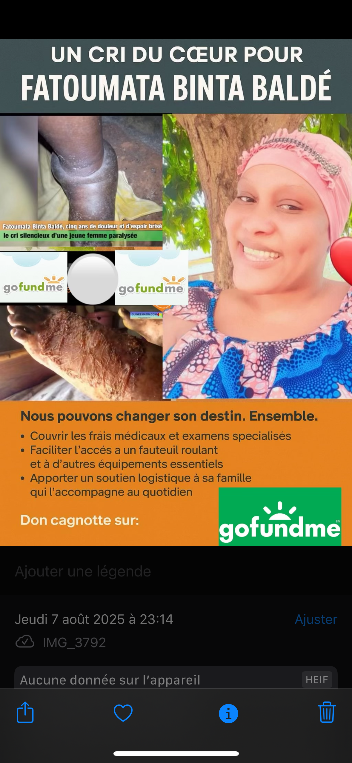 Privée de l’usage de ses jambes, elle ne peuvent ni marcher, ni travailler, ni assurer ses besoins essentiels. Elle vit avec sa mère, sans aucune ressource stable. Son seul espoir repose sur la solidarité de celles et ceux qui refusent de détourner le regard.