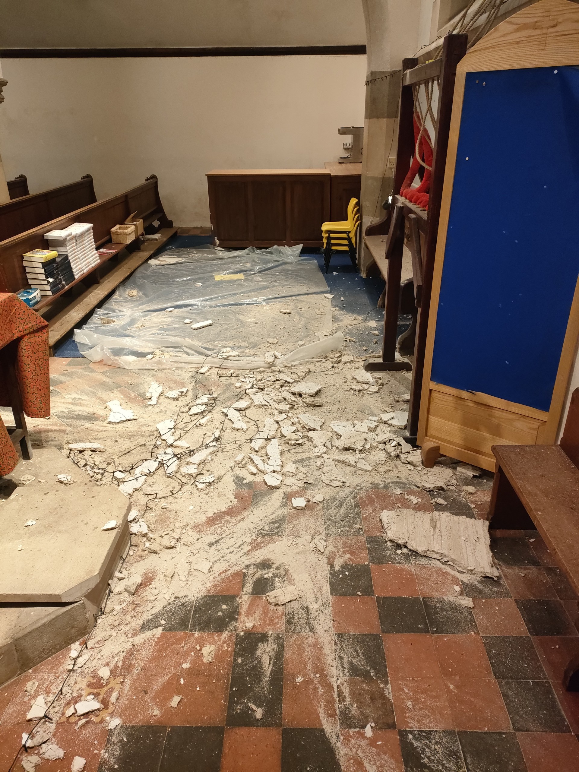 In December 2024, a severe storm caused serious damage to the church steeple, blowing off a trap door and damaging the roof. Water leaked inside, cracking tiles and even bringing down part of the ceiling. Sadly, insurance will only cover a small part of the cost — and repairs are expected to total £40,000–£50,000.
