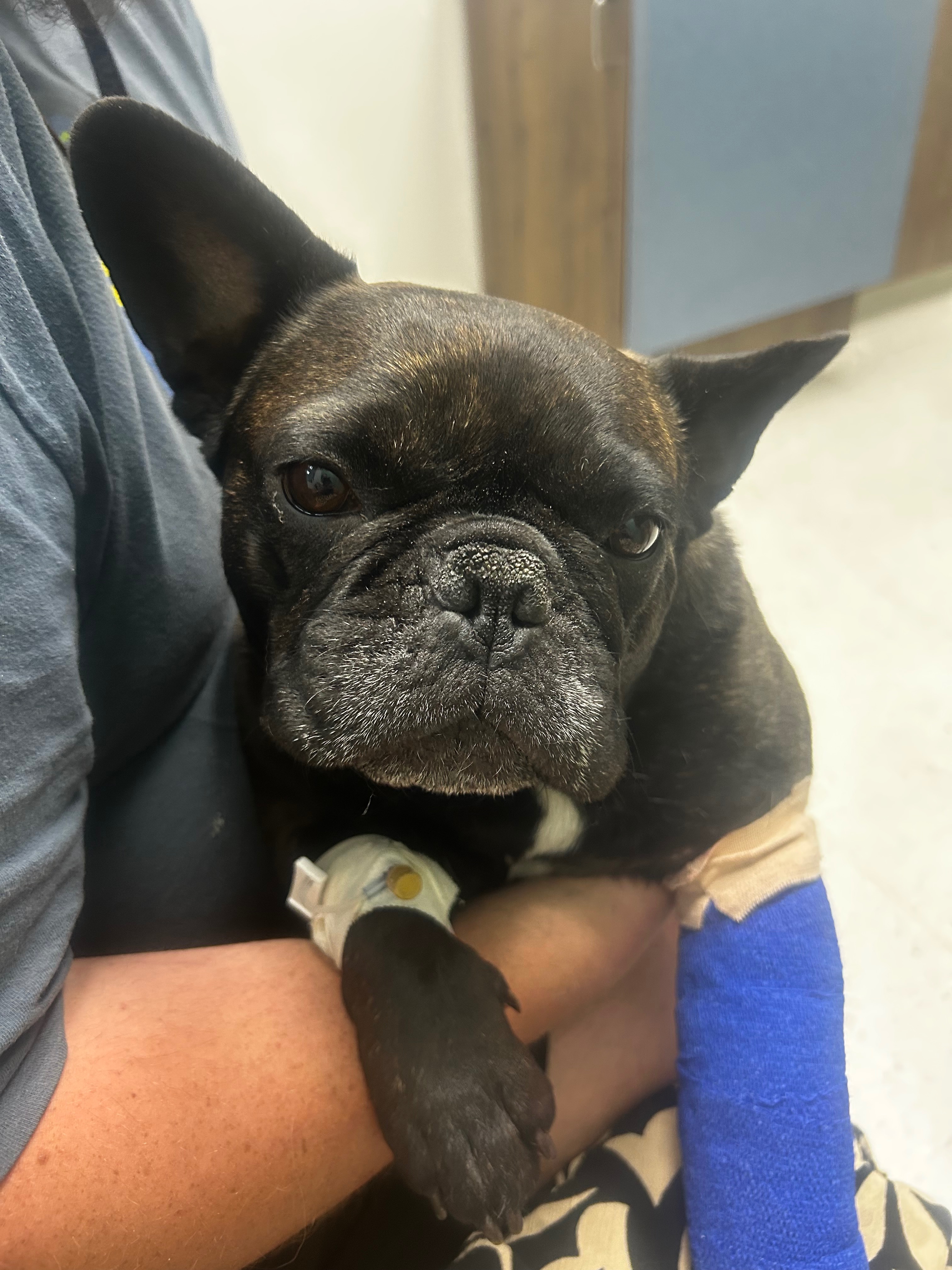 In a series of unfortunate events on Thursday, August 7th, 2025, Gabby was accidentally let out of the house unbeknownst to me. She ran after me as I was leaving to run errands and became lodged under my tire. She sustained injuries to her front left paw, her abdomen, including bruised lungs, and a hind leg injury. We rushed her to the emergency vet as there was a lot of blood, and she was struggling to breathe (more so than normal Frenchie behavior). After a series of tests, treatments, and observation, she was transferred to a 24-hour emergency vet in Bluffdale, Utah. She has racked up a few thousand dollars in vet bills and needs continued care, such as daily wound care and potentially future surgery.