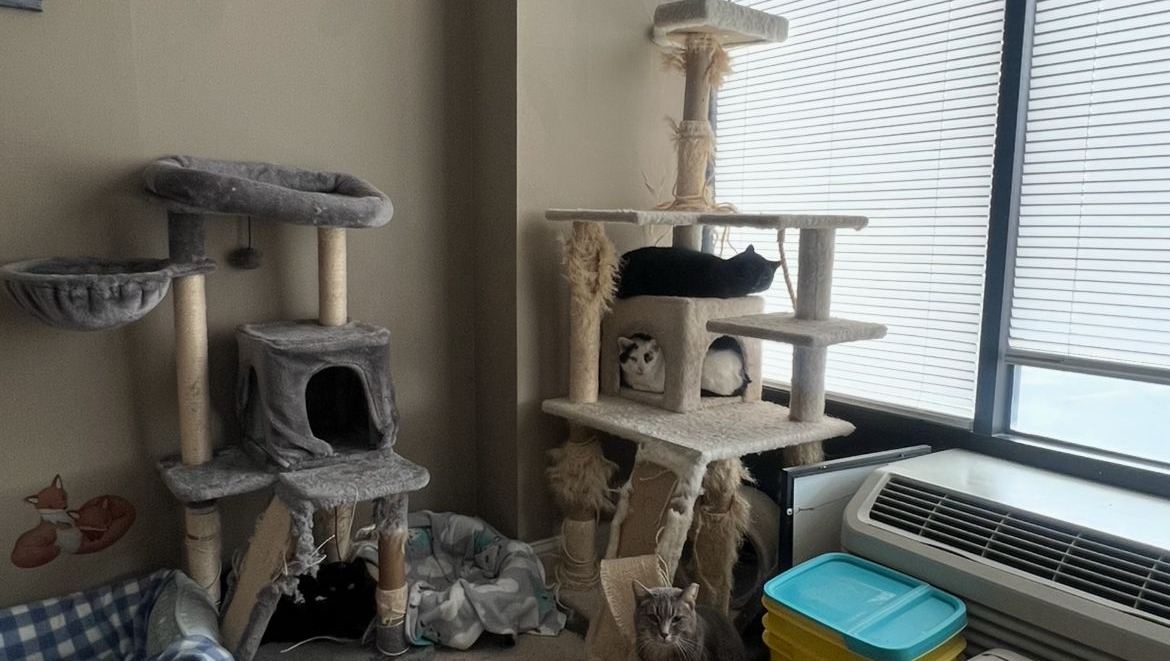 Mosby decided he did not want to be in a room by himself and "escaped" over the ceiling and down into the room where Rocio's other kitties are living.