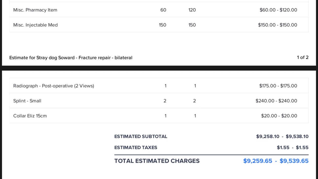 The prognosis is pretty severe, but hopeful. I attached the x-ray and her legs are very much so broken. It’s a lot to absorb and I’ve been so emotionally drained, but the light of hope I have is how amazing this community is and all of the efforts to save her. She deserves it. The vet said she was an angel. Zero aggression and still wags her tail. She’s about 2-4 years old. She received rabies vaccine, pain meds, flea meds, dewormer (and the puppies too), brand new casts and wound care treatment. I attached the bill that I paid. I will return Thursday the 1st for another bandage change and to discuss surgery or a plan. I have no idea what I’m about to face but my goal is to remain fully transparent and keep everyone updated on her progress. She wants to thrive so so badly, and that’s exactly what she deserves. Again, my heartfelt thanks to everyone who shared or donated or sent healing energy her way: it's working! She’s feeling all of it.