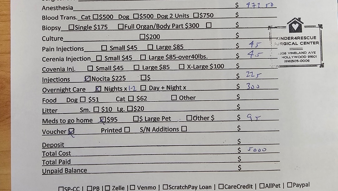 Thank you everyone. I’m at Newport Harbor Animal Hospital now (4/26 at 8am). Attached vet bill I’m paying for right now. Looking at $680 plus additional costs for future bandage changes, vaccines once her immune system is back up and essential puppy care once they reach age.. Will be getting X-ray done now and keep you updated on results of severity. This is going to be a journey. I’m forever grateful to everyone who is sharing and supporting saving this sweet family. I seriously can’t do this without your help. Please send all the healing energy this way..