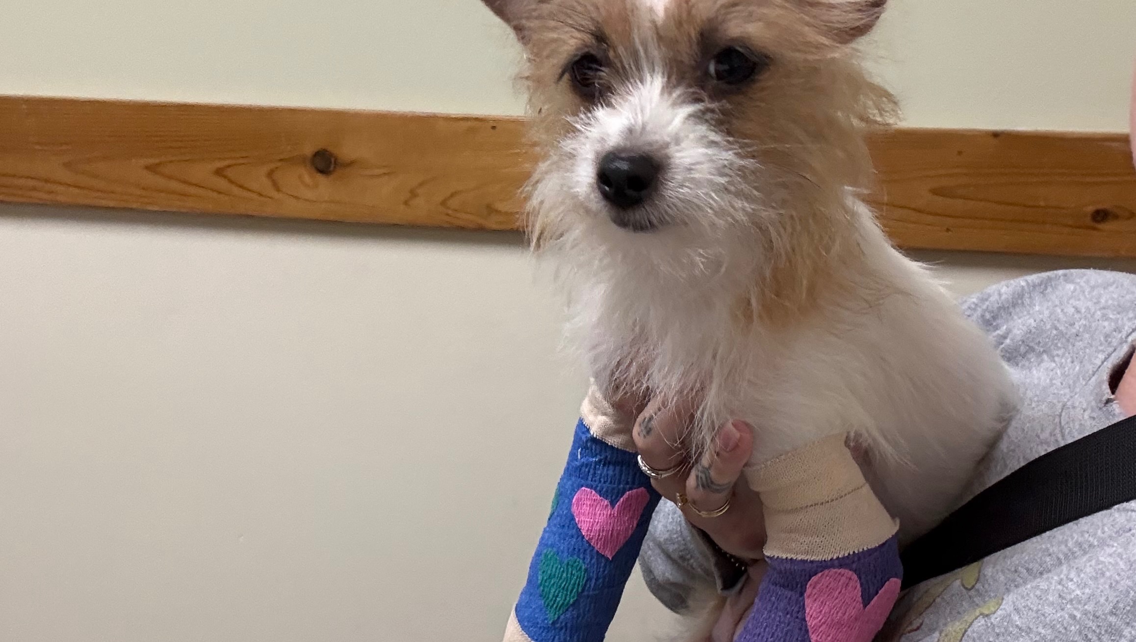 The staff added hearts to her leg bandages. Adorable!