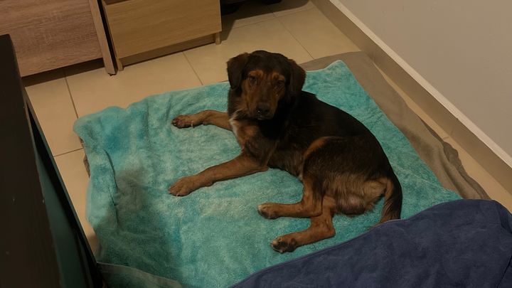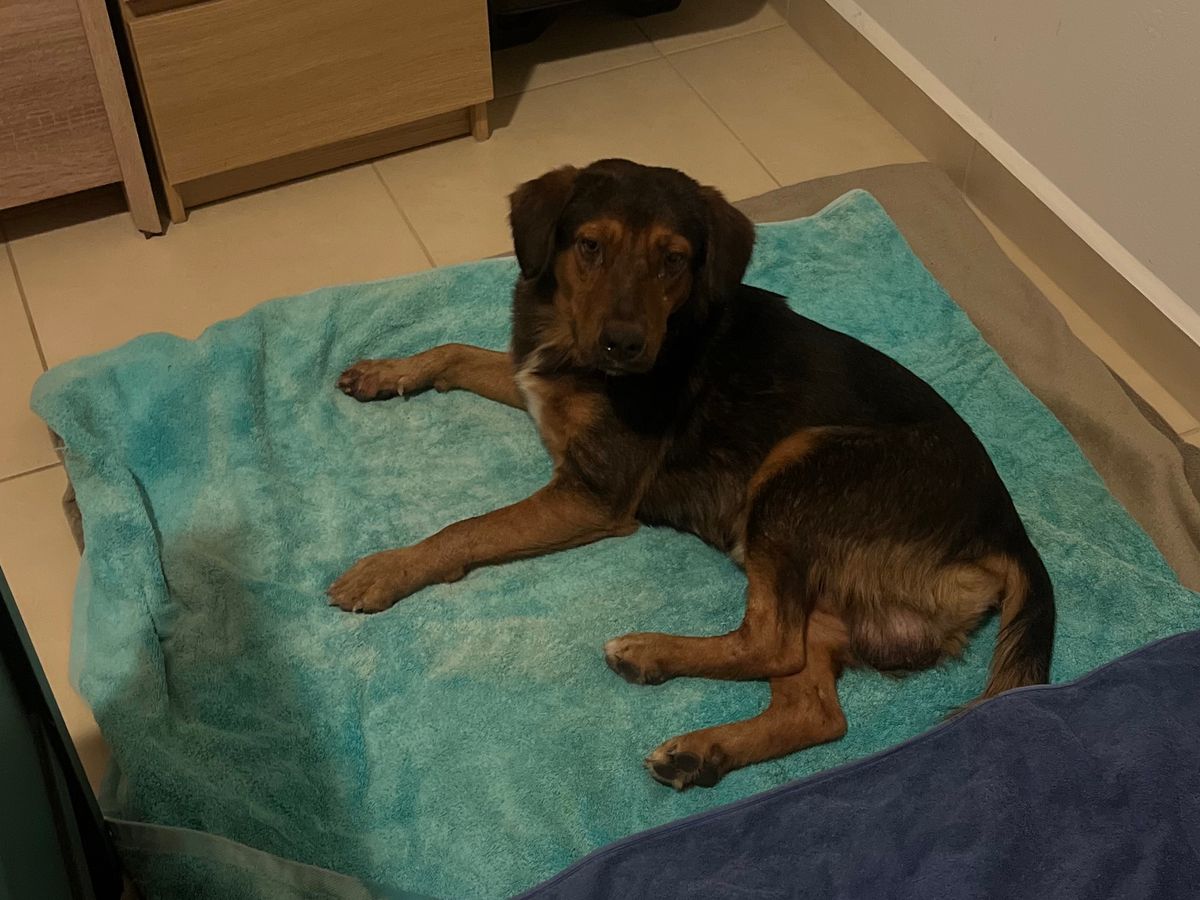 My boyfriend and I found this pup on the side of the road. The dog had clearly just been hit by a car as he was trying to wiggle his body off the road, but he could not move. We immediately took the dog to the vet to get x-rays, bloodwork, pain meds, and antibiotics. We will do everything we can to get this dog the medical attention he needs. Please help if you are able.