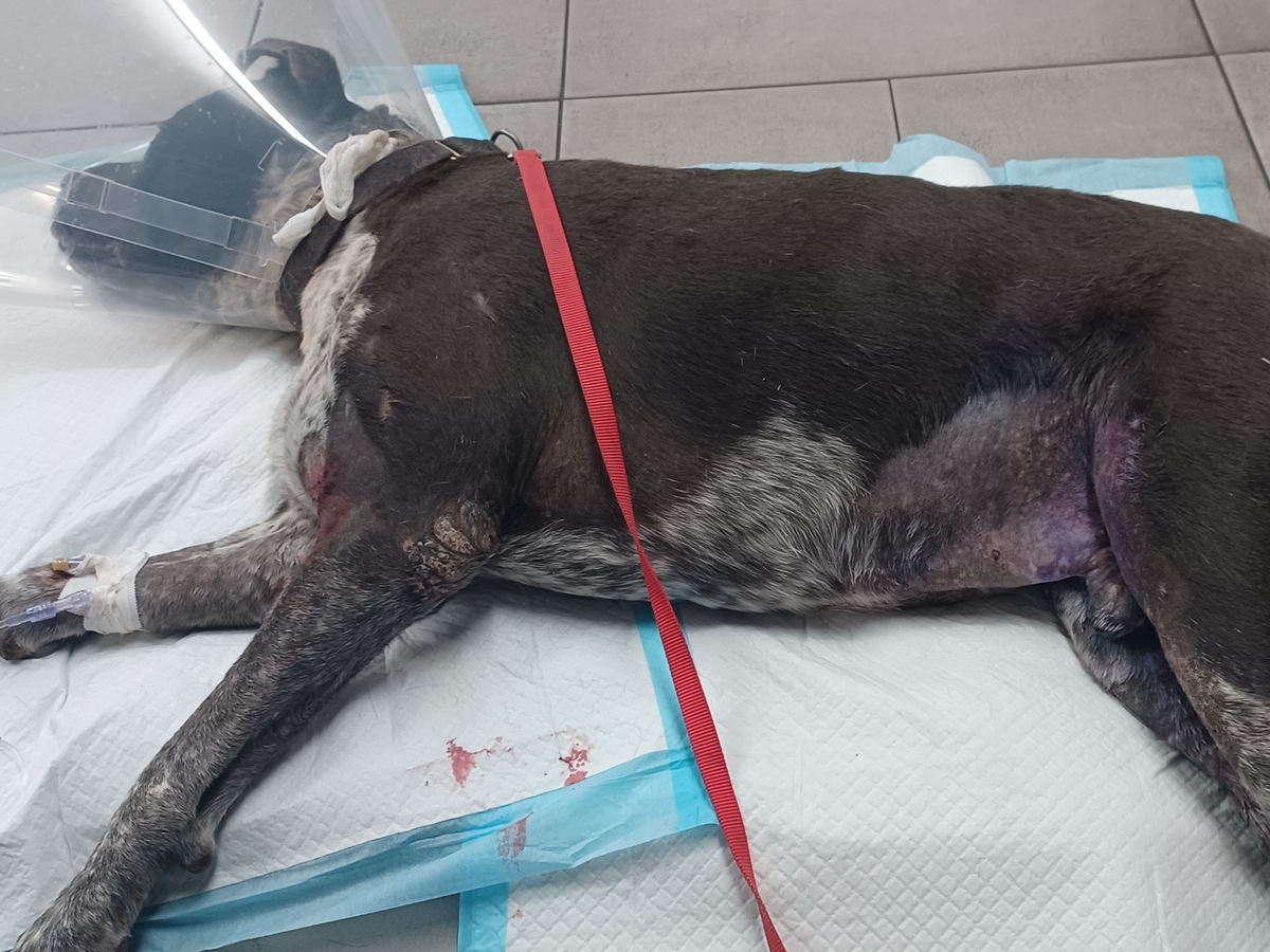 My name is Patrick, and I'm reaching out asking for help. Recently, my dog Arminius was attacked by a pack of javelinas while trying to protect his pup' that he was playing with on my property. He sustained serious injuries, including a puncture wound in his neck, a deep wound in his belly/groin area (which nearly reached his internal organs), and injuries to his leg requiring stitches.