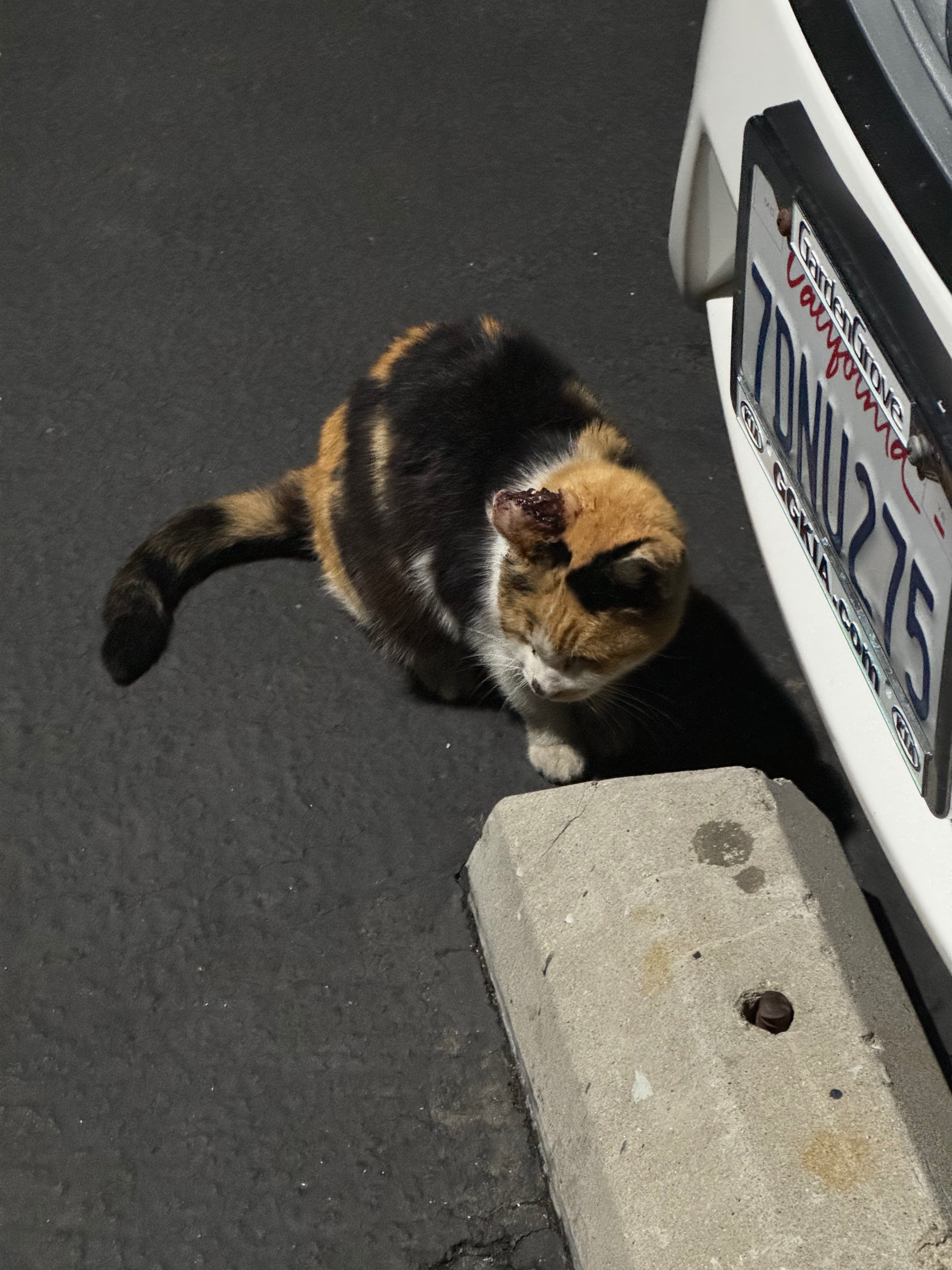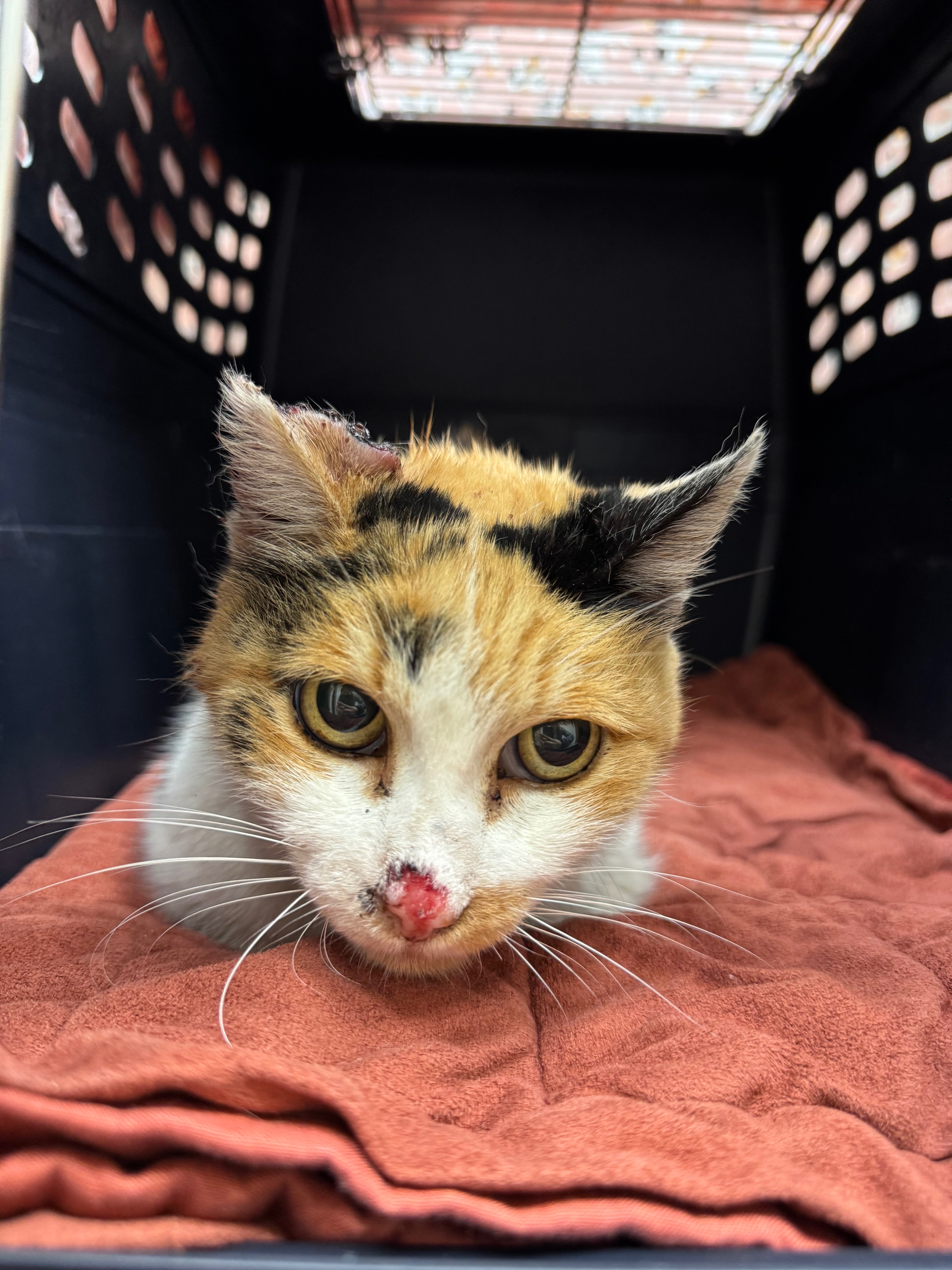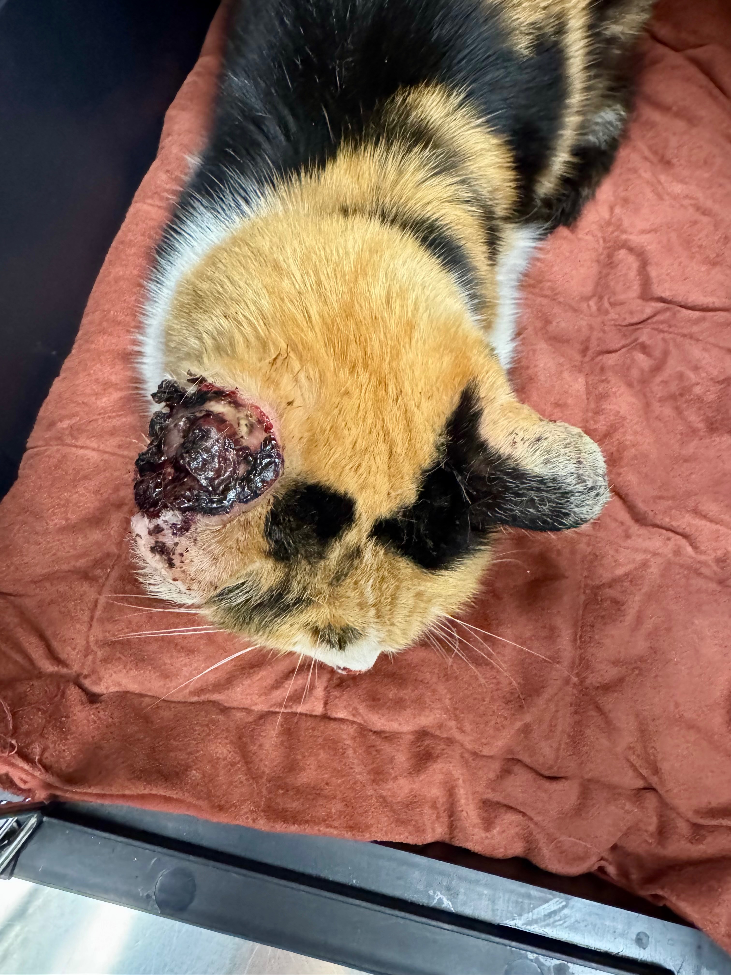 This is Callie, our calico stray. She was taken in because of the wound on her ear and the vet has diagnosed her with cancer. She’s been taken in by our volunteer-run cat rescue (OC Community Cat) and is in dire need of funds to cover her vet bills.