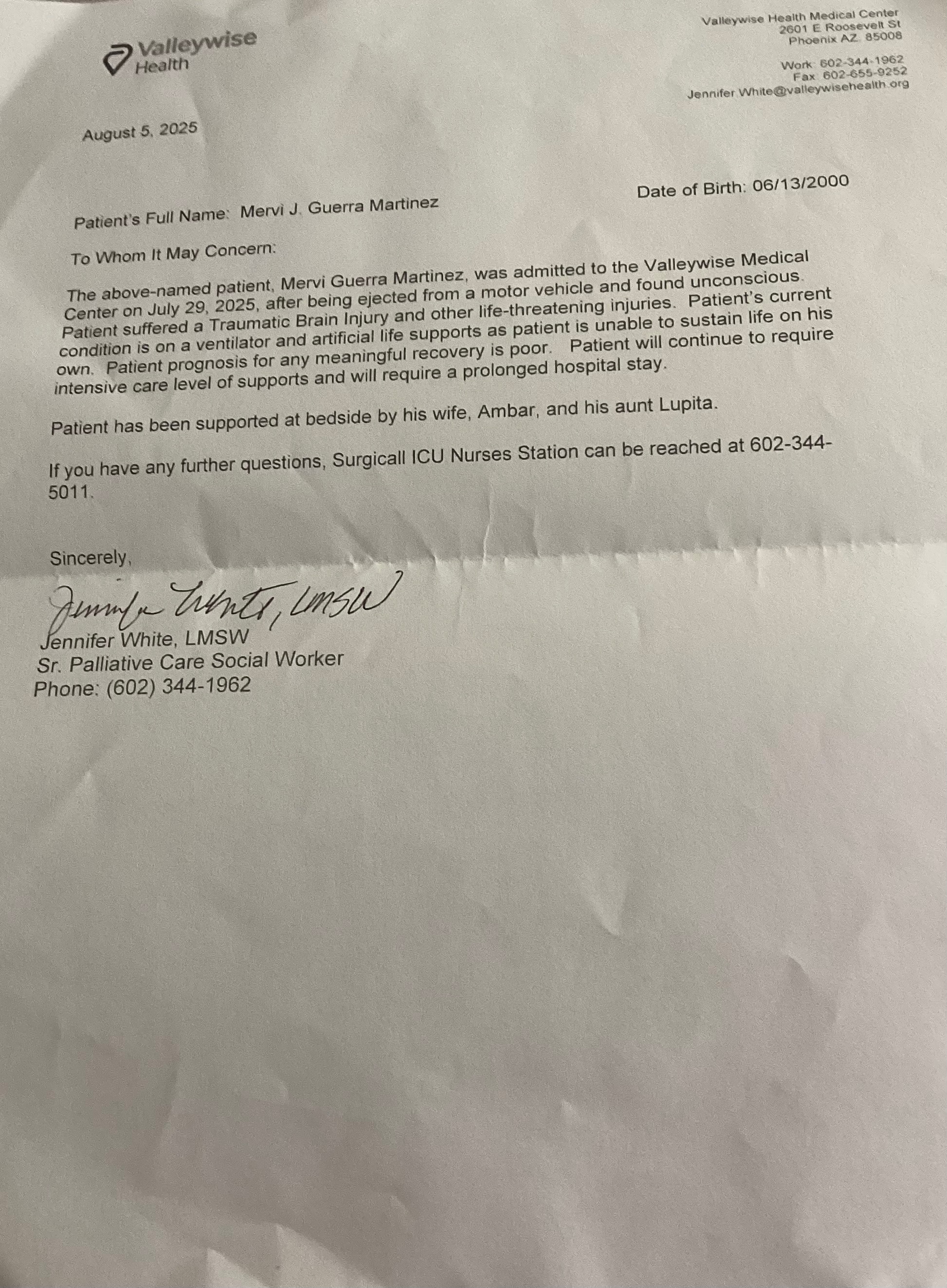Mervin Josue Guerra is a 24-year-old young man, father of two children and husband, he arrived in the United States looking for a future together with his family, Last July 29 at 6pm he was the victim of a traffic accident in Tempe (Arizona) Loop 202 ... being seriously injured, He was urgently transferred to the Valleywise Health Medical center clinic, where at the moment he remains in an indefinite state of coma, He has no one in this country, I as a close friend of his am organizing this collection, The funds raised will be used to cover various medical treatments and all the vital expenses for his two children of 1 and 3 years old, His condition is very critical and he needs a lot of help at this time, Any help large or small help will add up, If you can't donate just by sharing this campaign you will help a lot, Thank you and may God give back to each of you your multiplied.