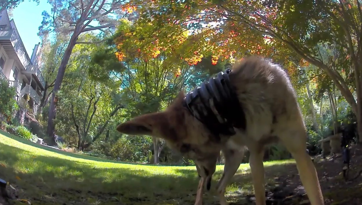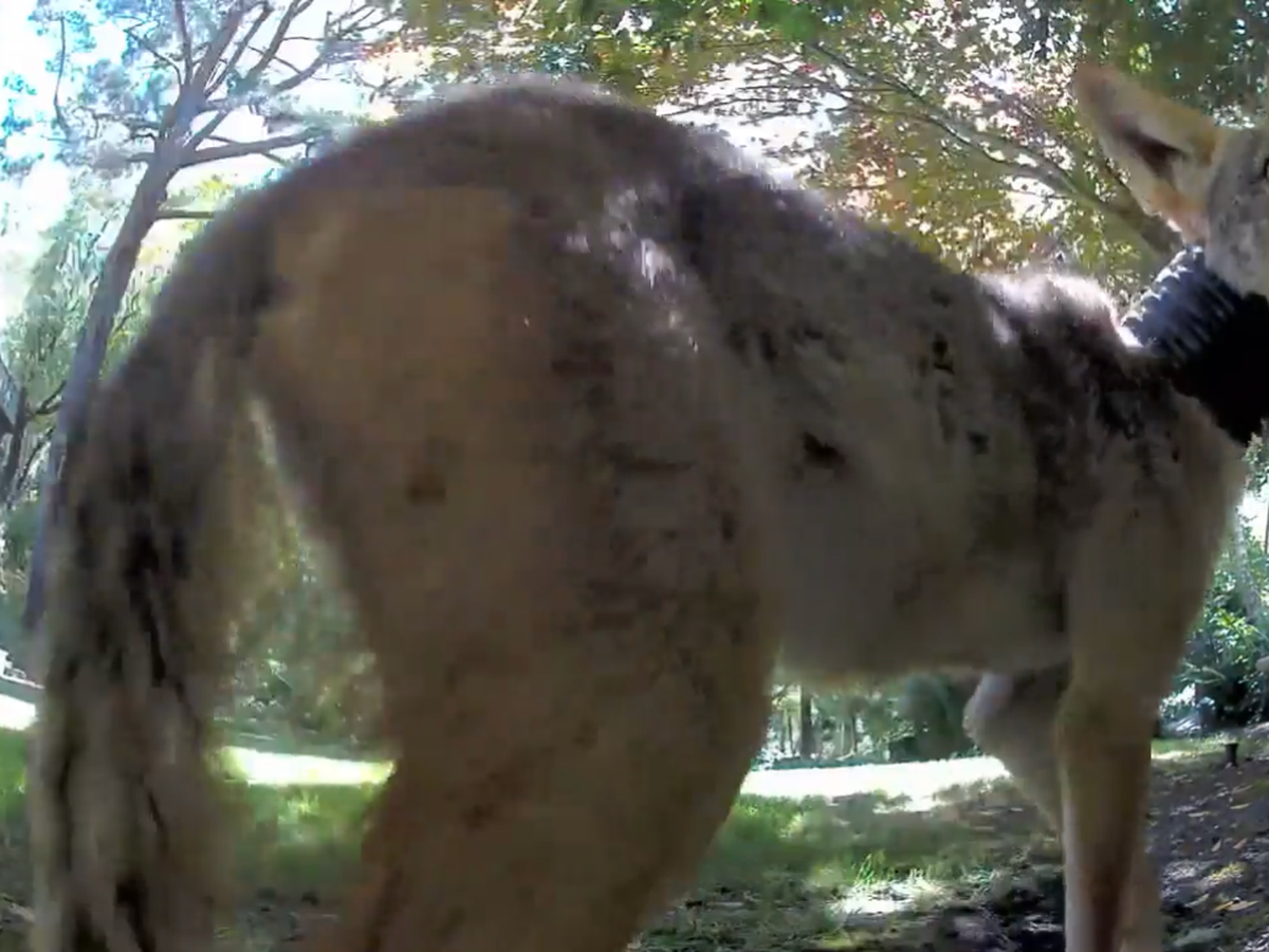 In the backyard of a Hillsborough resident, a young coyote with its neck tangled in a tube/wire has been spotted.