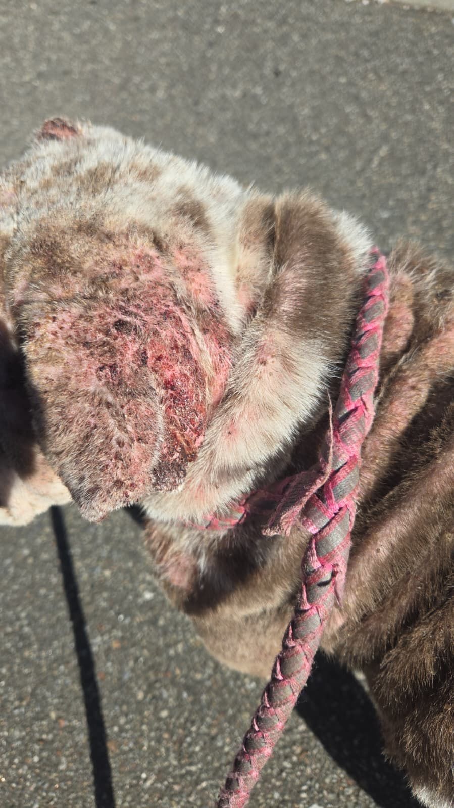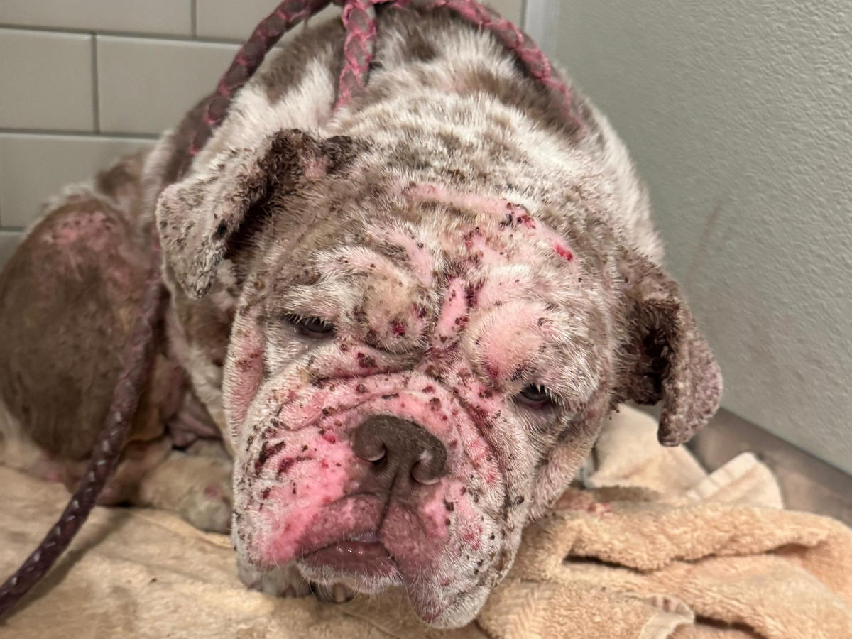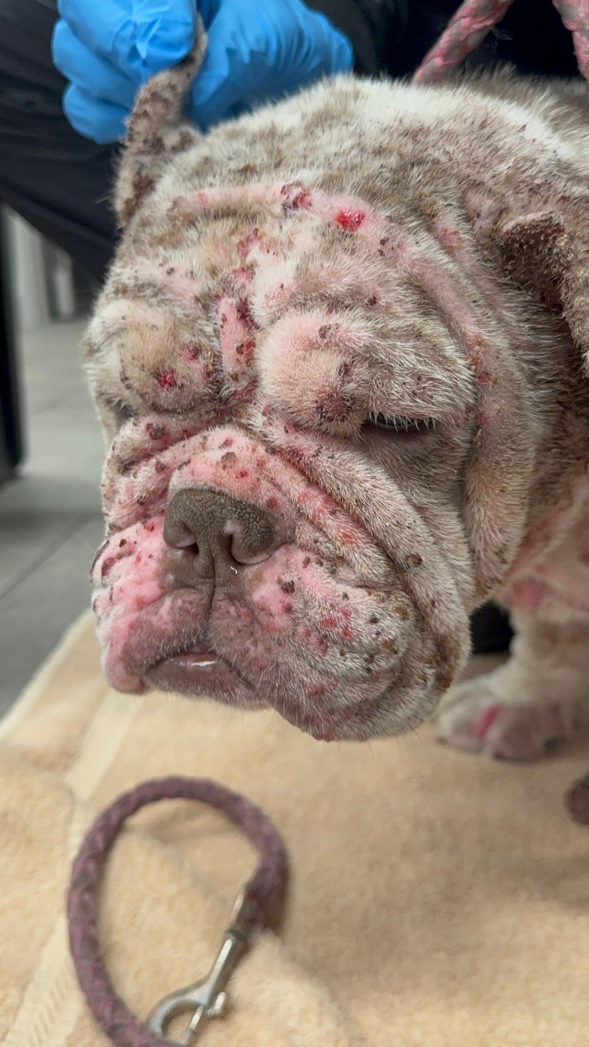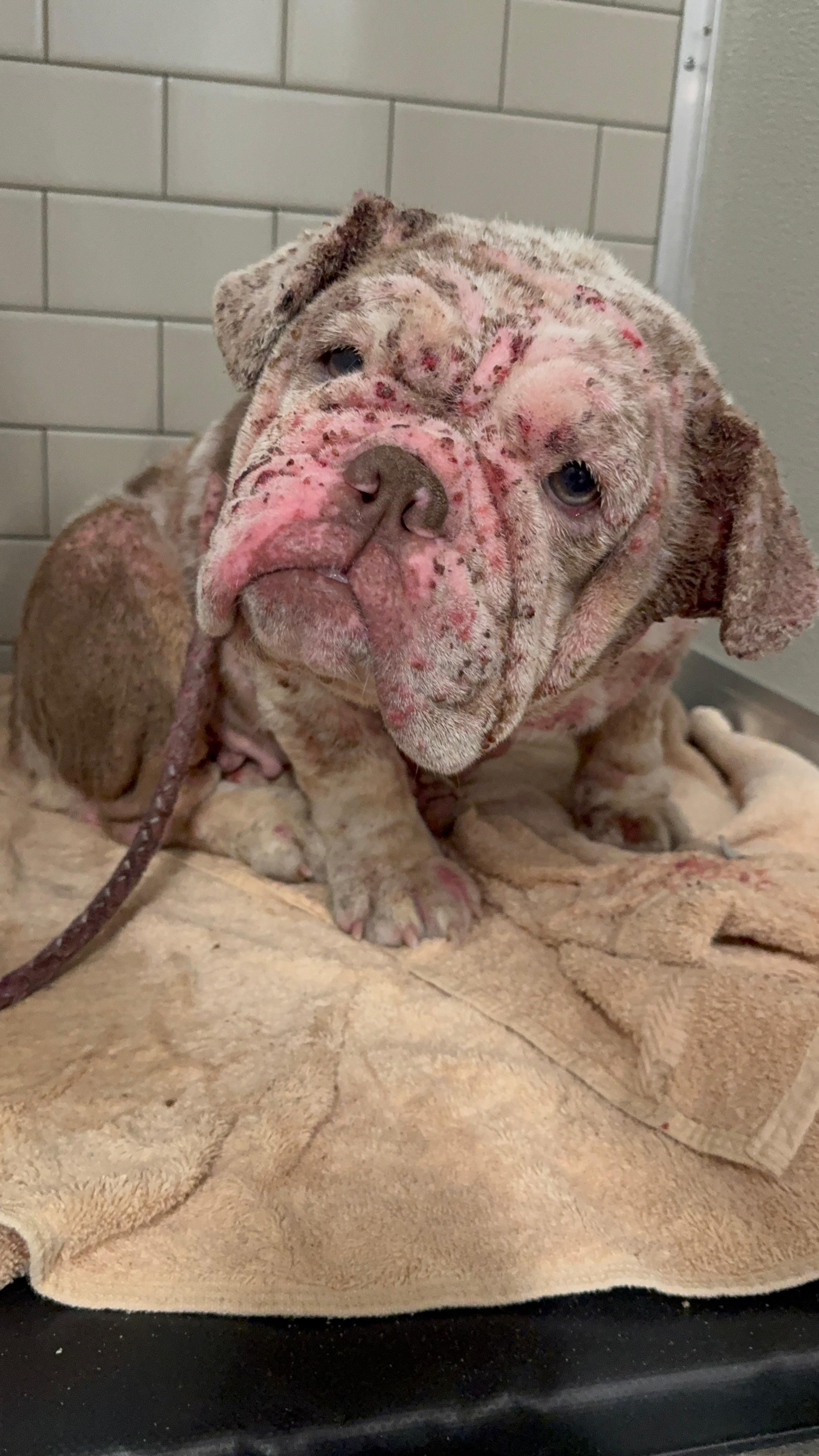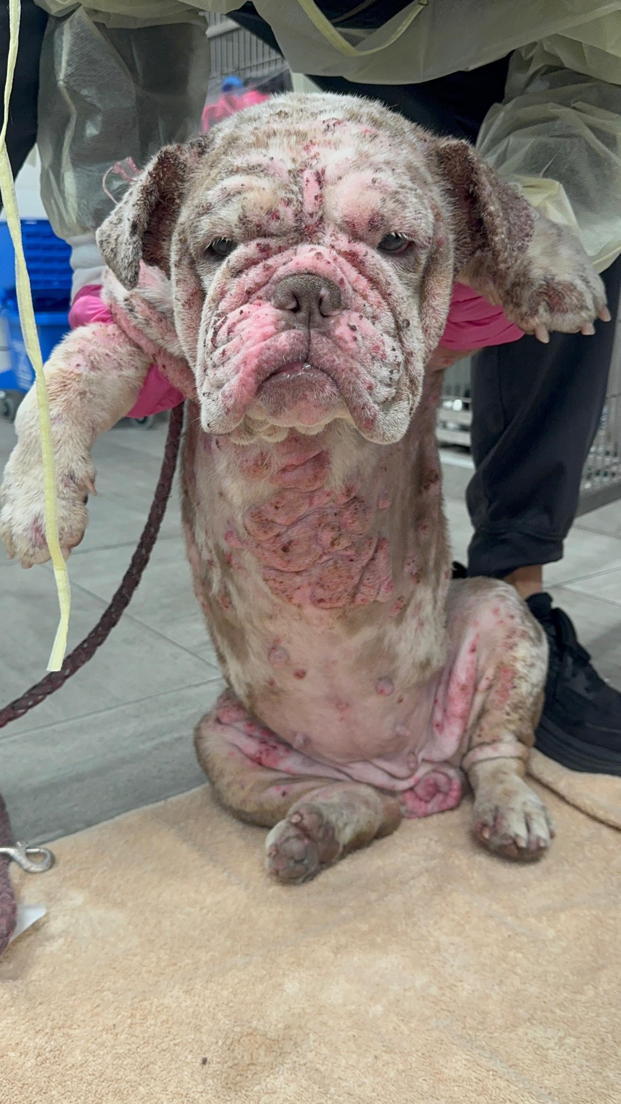 We were contacted about a dog found in absolutely horrendous condition. When we first saw her, our hearts broke. We’ve named her Cookie, a sweet name for a dog who has endured unimaginable suffering. She’s covered in open sores, bleeding from multiple places. Her skin is raw, inflamed, and oozing. There isn’t a single spot on her body that isn’t wounded. She’s emaciated, and the smell of infection fills the room before you even reach her. You can see the pain and exhaustion in her eyes.