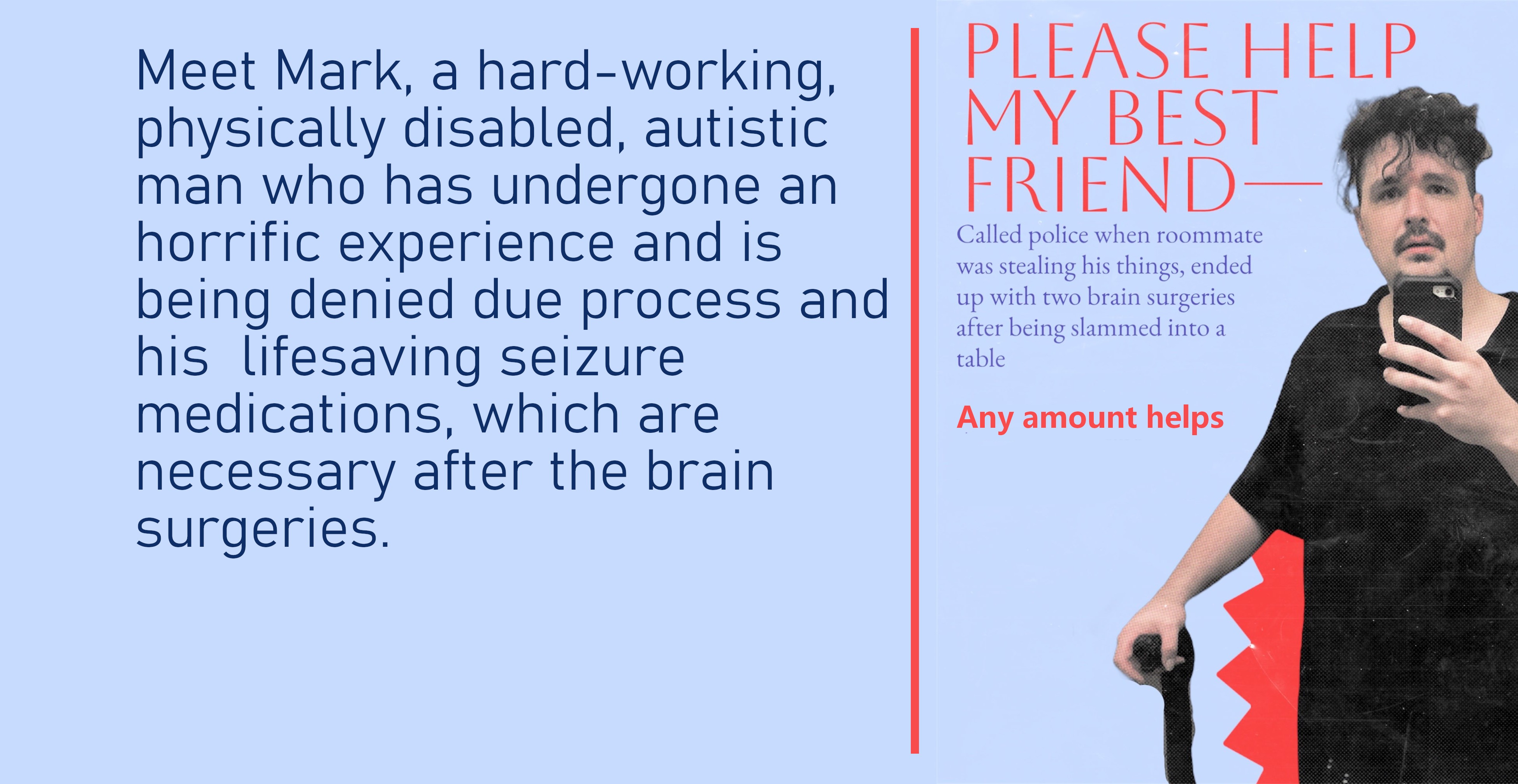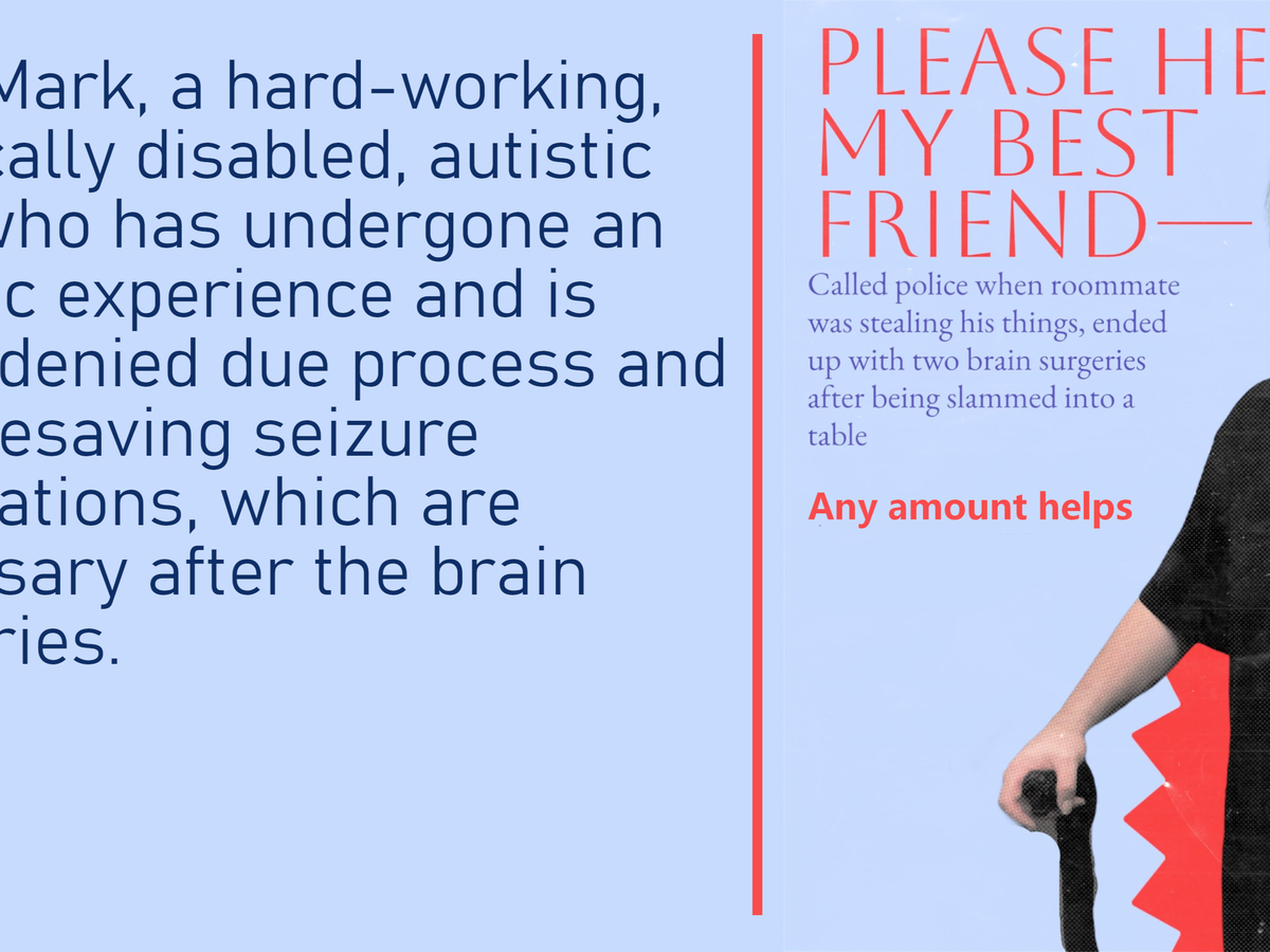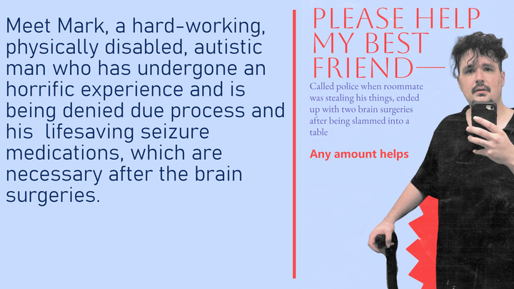 The police told him he would be arrested for a misdemeanor. Then, while Mark was suffering multiple brain bleeds and trying desperately to convince them he needed medical attention, the deputies spent TWO HOURS adding more charges, culminating in him being charged with three counts of "holding the movers under false imprisonment." Now he is in the county jail. He has not been convicted of anything. He went before the judge for his bail hearing, but he was not given a lawyer, not even a public defender. This goes against due process. Without a lawyer to help with setting the bond, my autistic best friend was given a bail of $35,000. He needs $3500 to get out on bail. Meanwhile, he is not being given the pain medication nor the anti-seizure medication that he was told was necessary to help prevent a potentially deadly condition after the double brain surgery he had to undergo due to being slammed into the table by the deputy. He is in pained agony due to not having enough Tylenol to help with the pain. He is in a wheelchair now, as well.