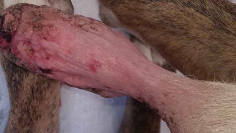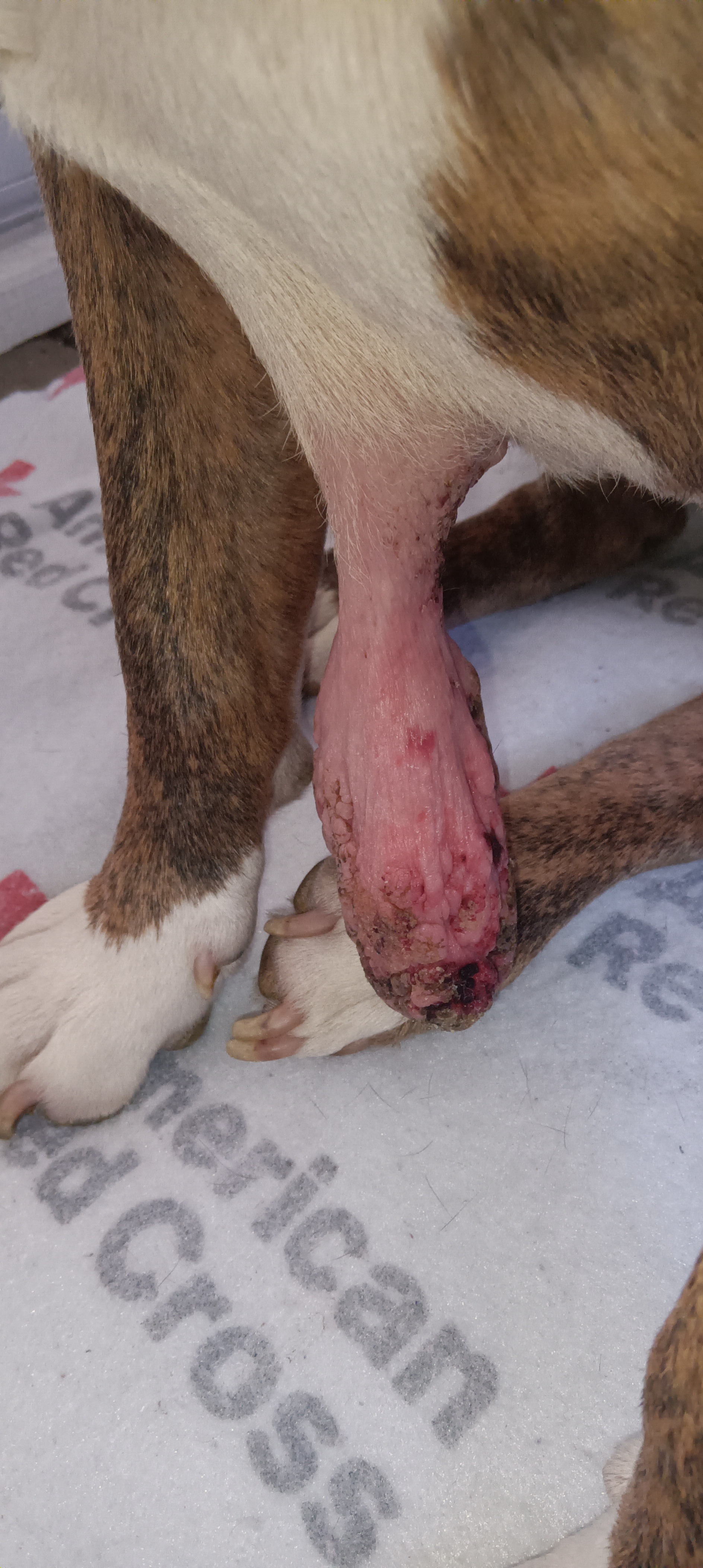 Right now, Lonnie is suffering from a very large tumor growing from the middle of her chest. It has become severe, and as you can see in the photos, it has grown to the point where it is hanging, irritated, and at risk of infection.