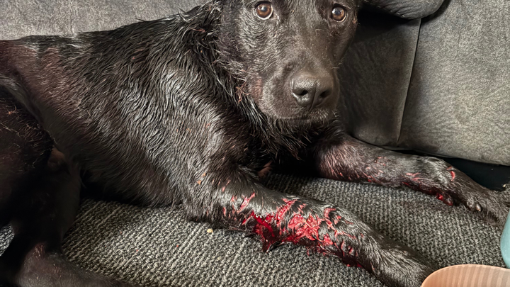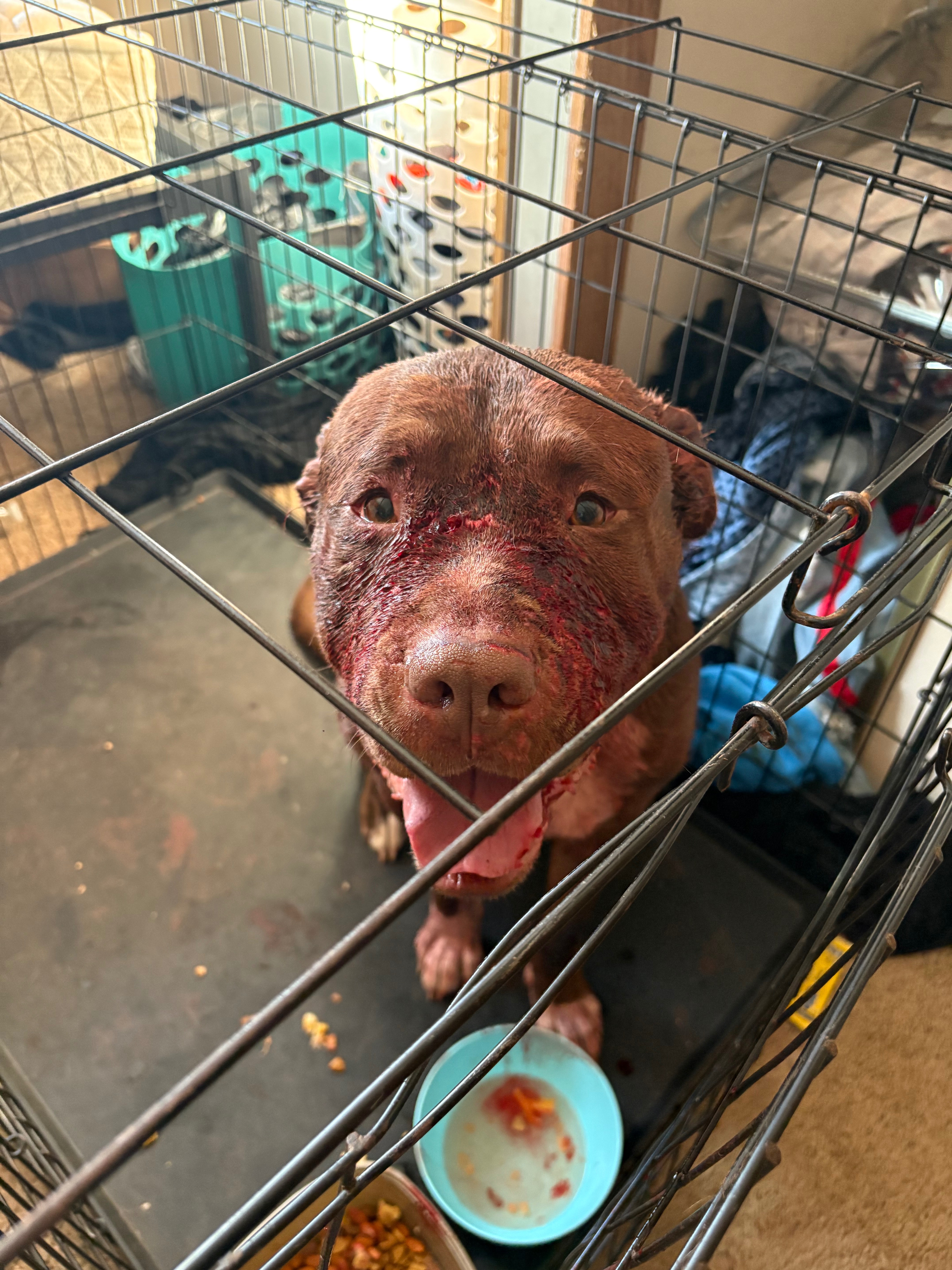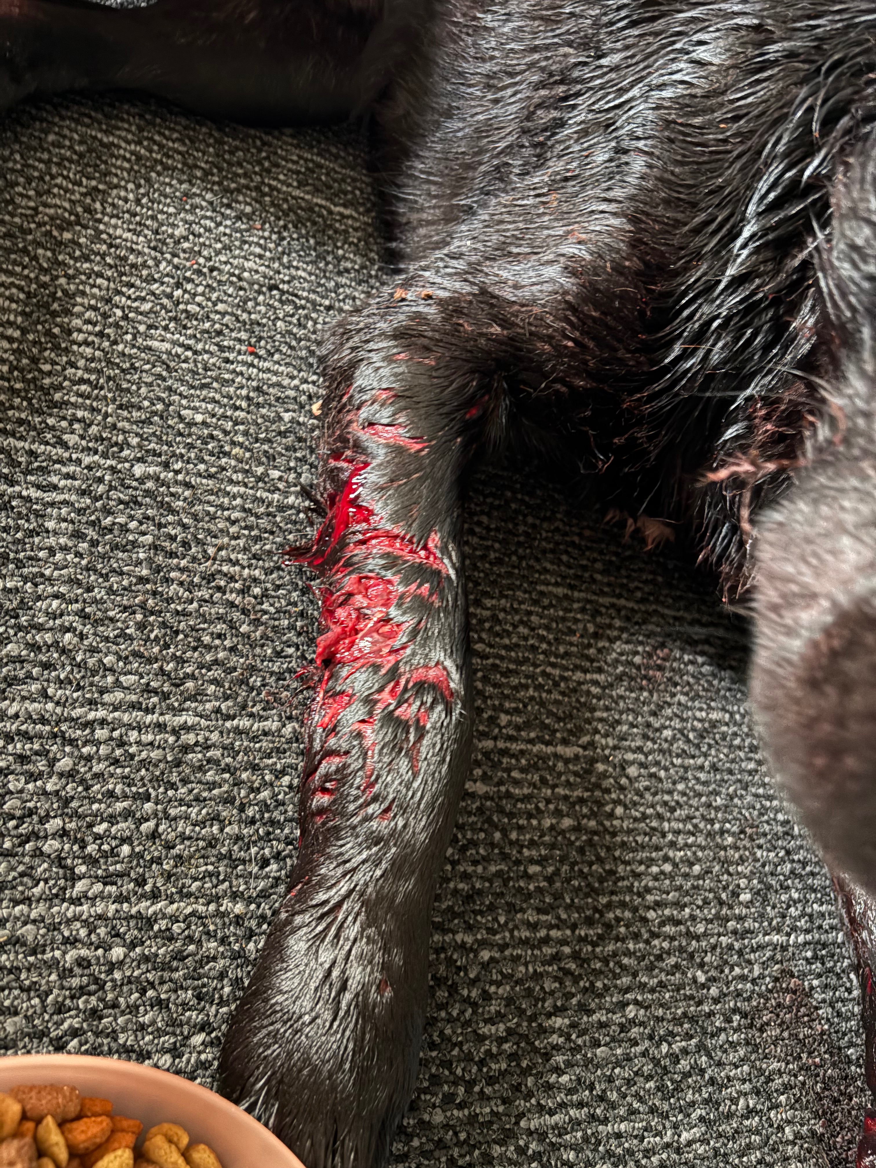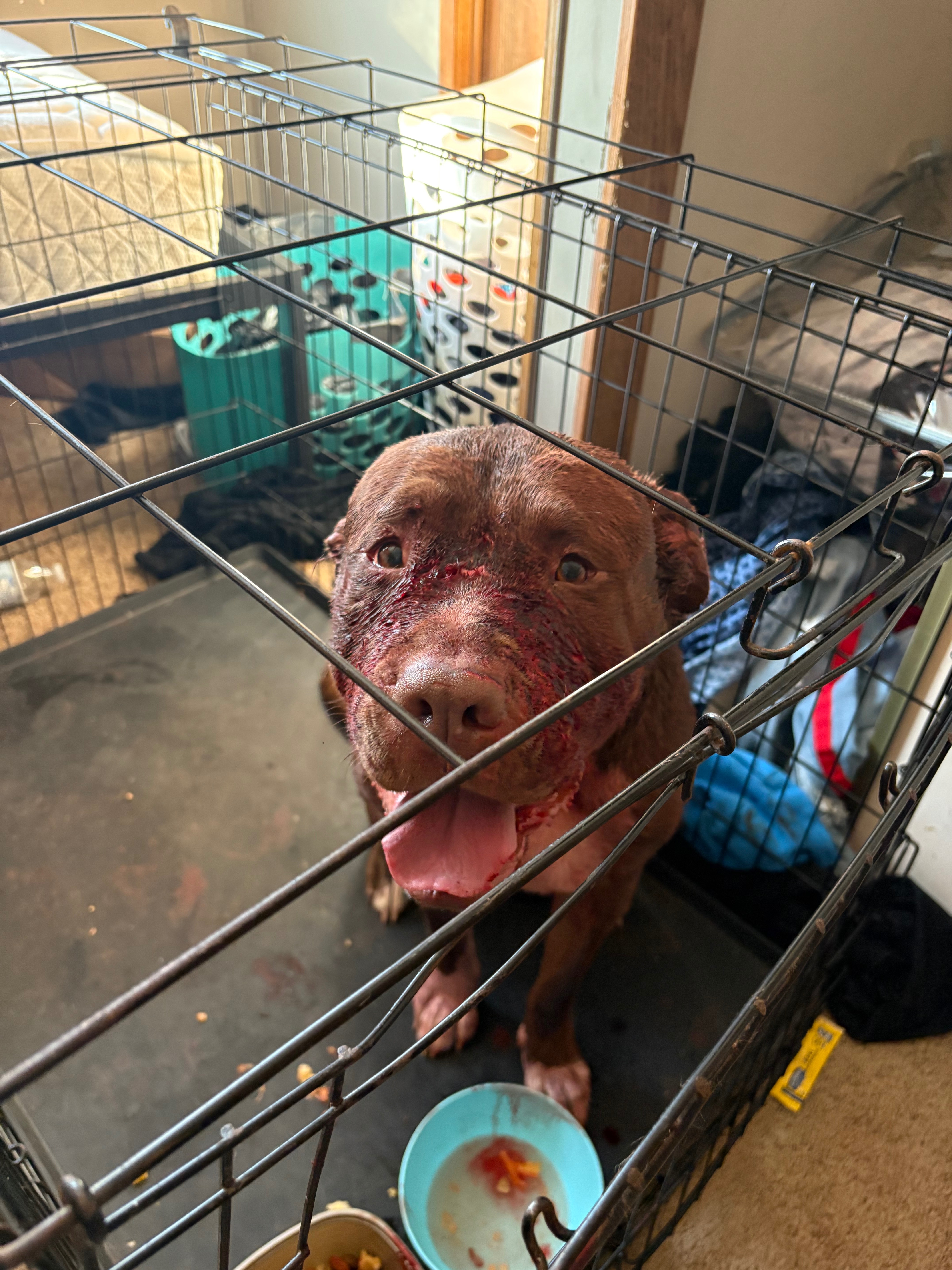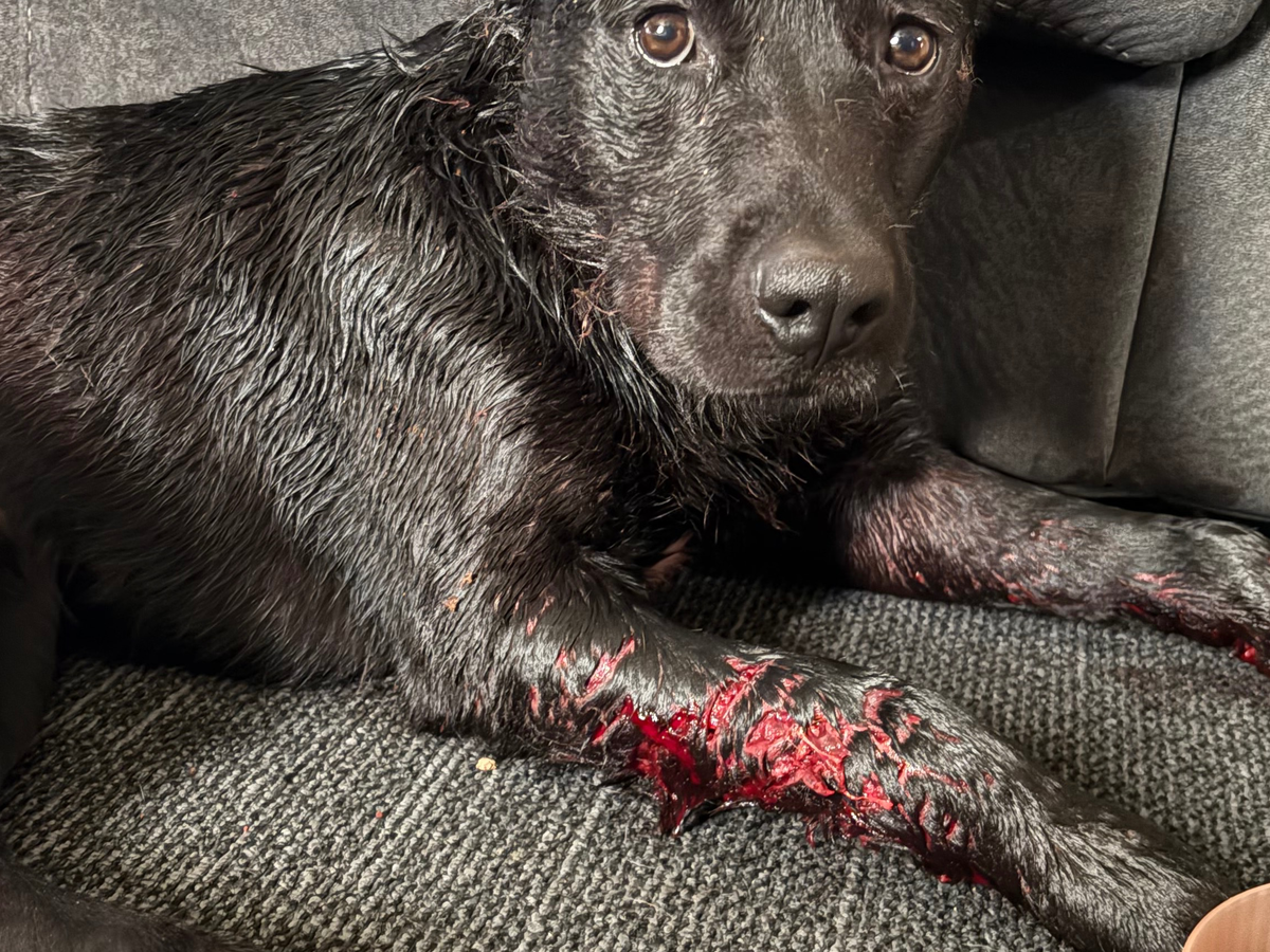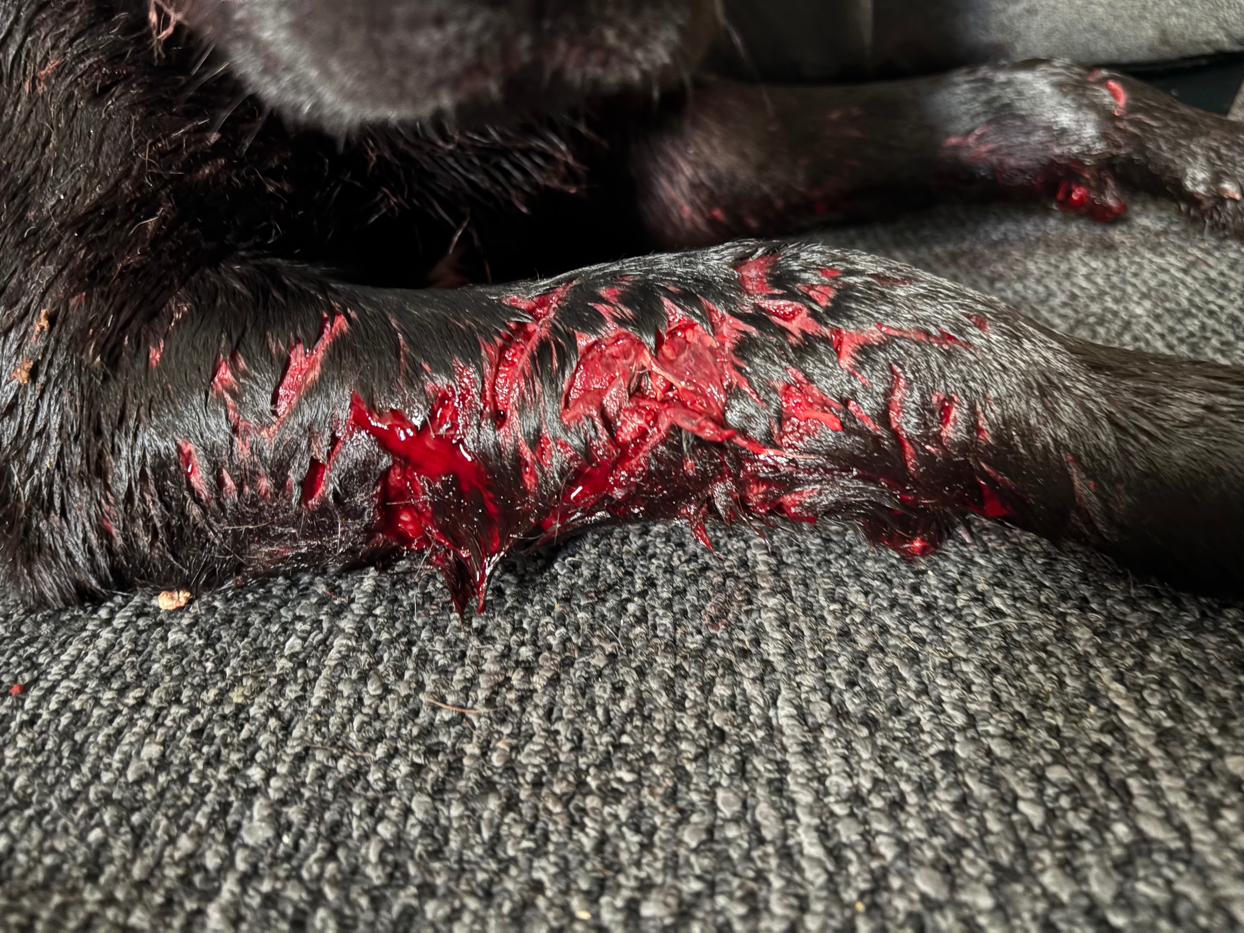 max is in the worst condition. One of his legs is so badly injured that the bone is exposed. He is in unbearable pain and can barely move. It’s devastating to see him suffering like this. Koda is also hurt badly, with deep wounds that need urgent medical care to prevent infection and further complications.