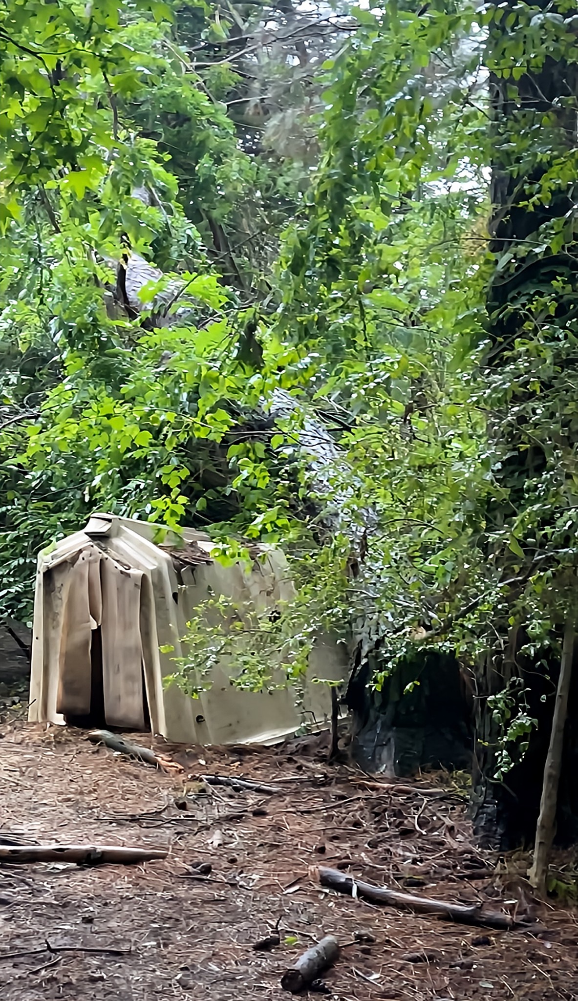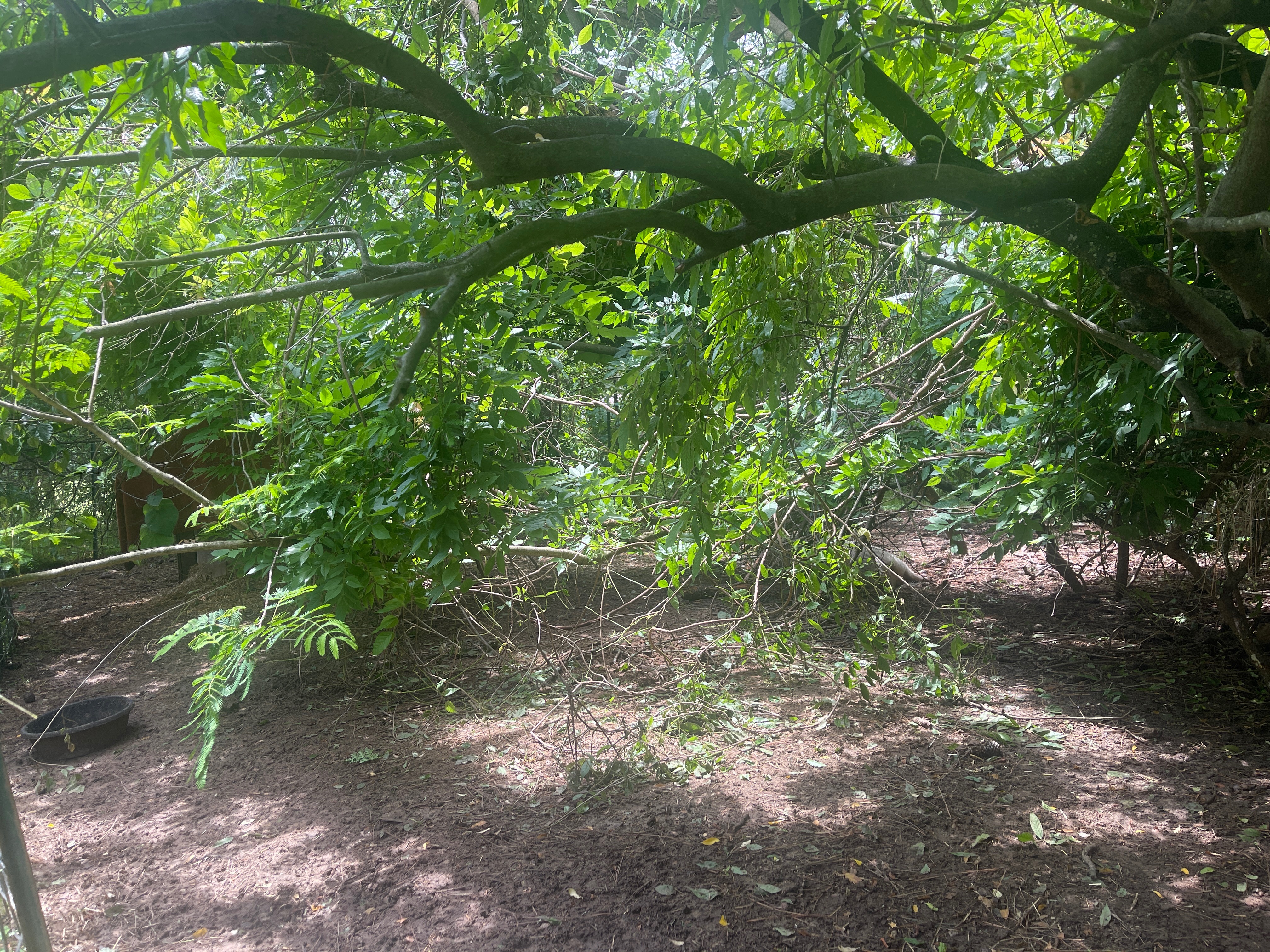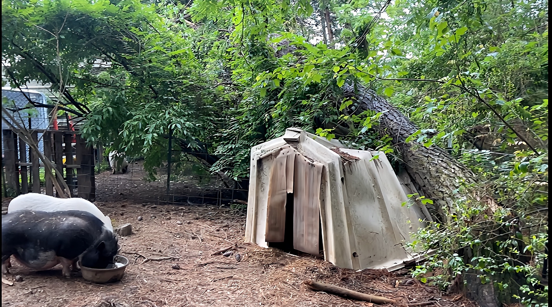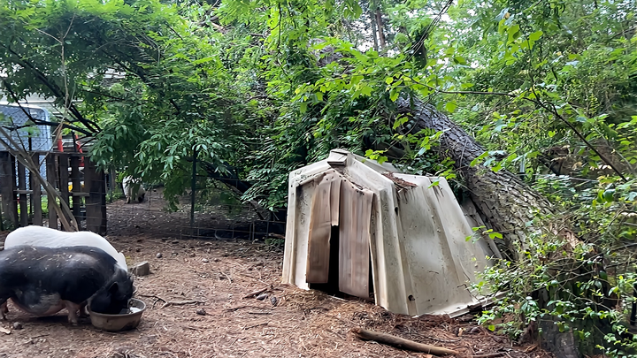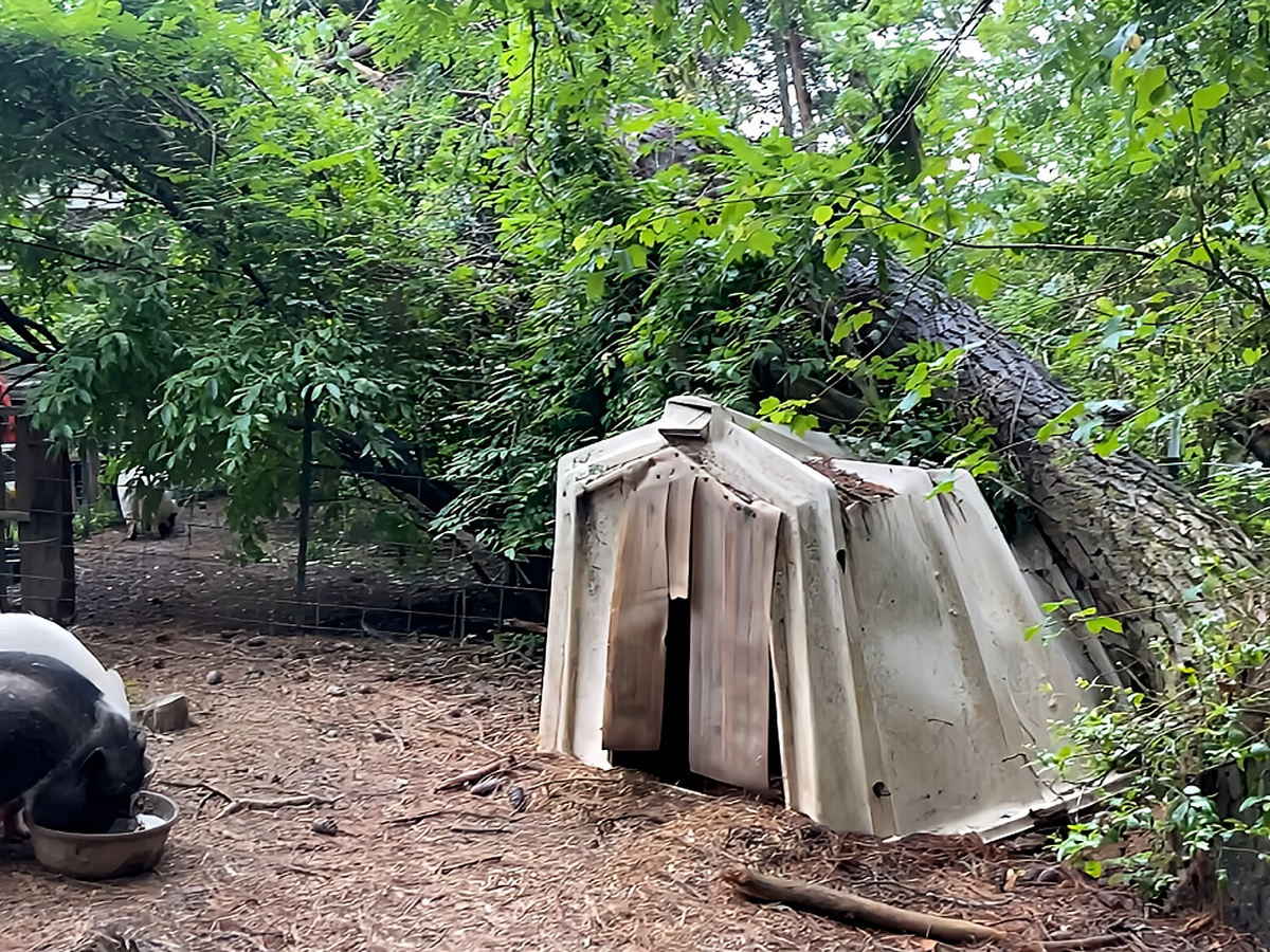 Hello, this is MOMMA TAMMY of Steven’s Forever Farm Sanctuary, and unfortunately, we had a horrible experience with a thunderstorm from hell. The storm had over 55-mile-an-hour winds, thunder, lightning, and even hail. We took such a hit with lots of damage. The worst being this over 75-feet-tall tree that went over into two pig areas and right in direct line with their sleep enclosures. That particular tree is caught up in other trees and vines, but we need it removed, plus all the other dangerous trees around it, as quickly as possible. Please help us raise the remaining amount needed to safely remove all this damaged tree material so all three pigs will be safe in their area again.