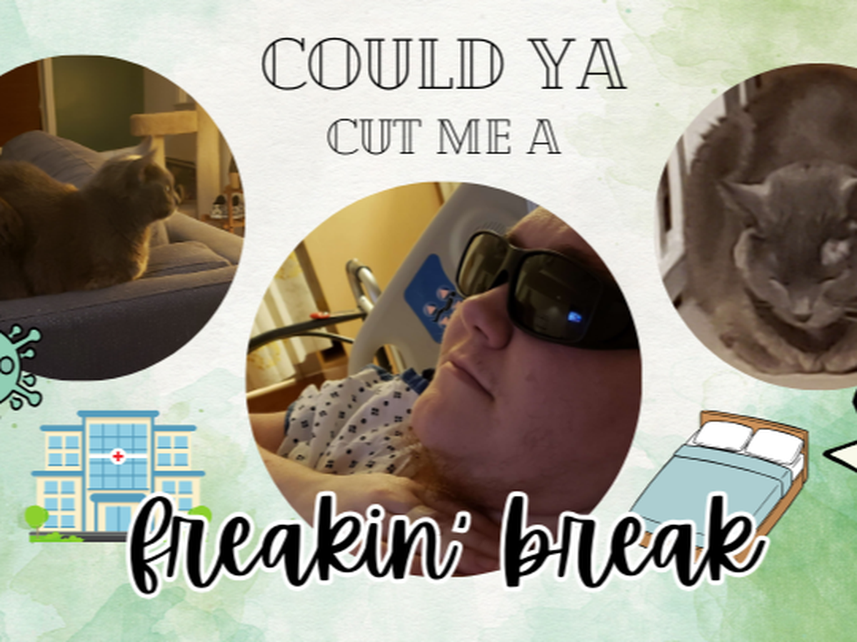[Image description: A banner with the text "Could ya cut me a freakin' break?" overlaid on several images. Two are of a small grey cat, and one is of Ren in the hospital, wearing a gown and sunglasses and grinning wryly at the camera. Scattered around the banner is clipart of the COVID-19 virus, a hospital building, a bed, and a bill. /End ID.]