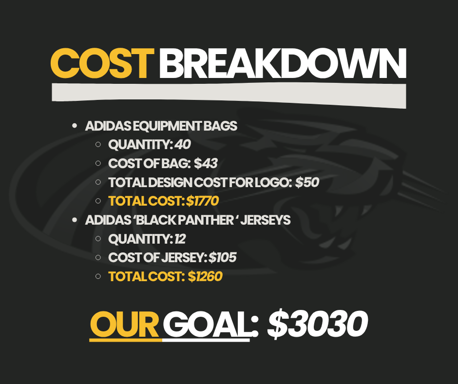 However, our current equipment bags are over a decade old — worn out and no longer able to keep up with our growing team. And with our roster doubling, we still need more jerseys and new equipment bags to ensure every Panther can take the field fully equipped and proud.