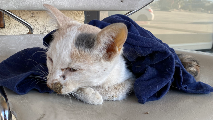 When she picked her up, the kitten didn’t even resist. She was weak, cold, and completely blind from severe eye infection and respiratory infection caused by extreme neglect and exposure to dirt.