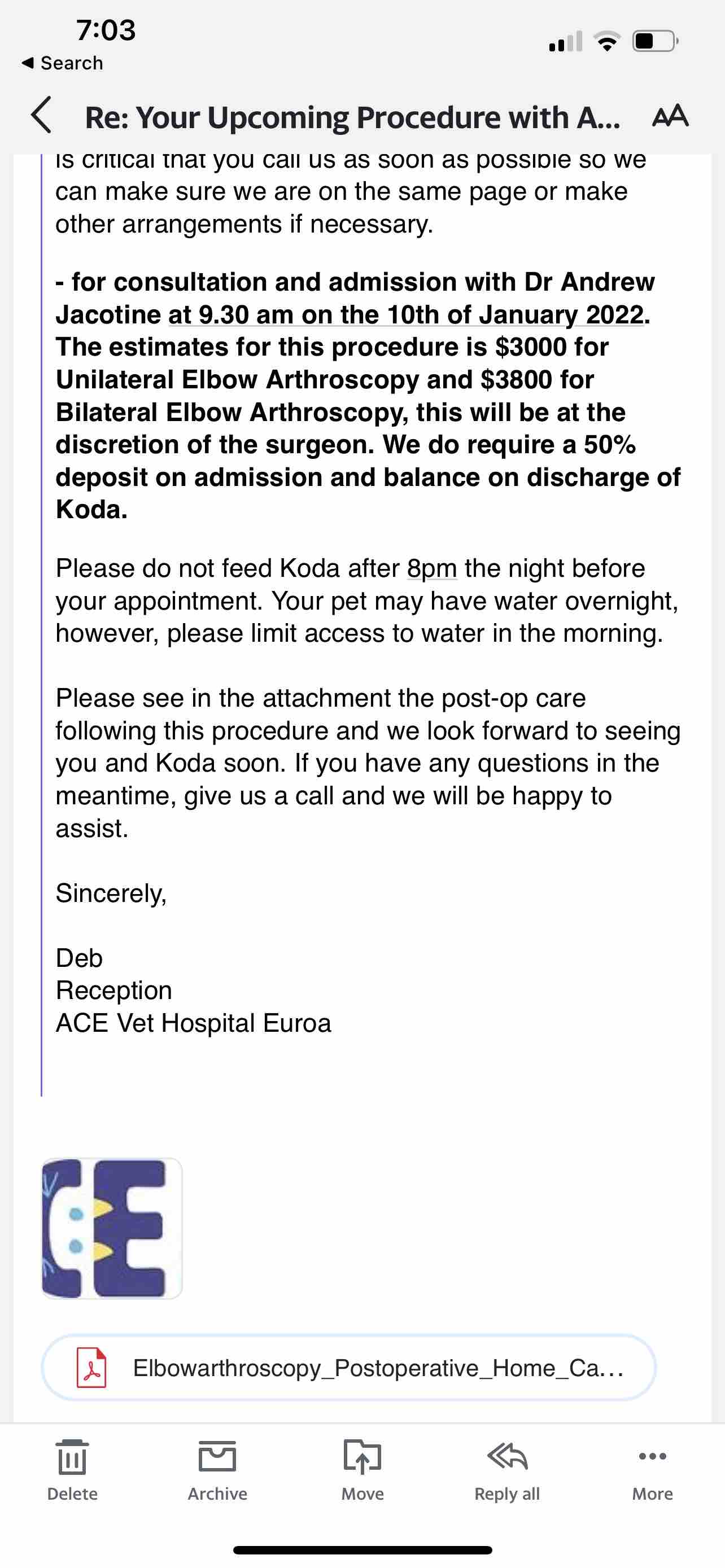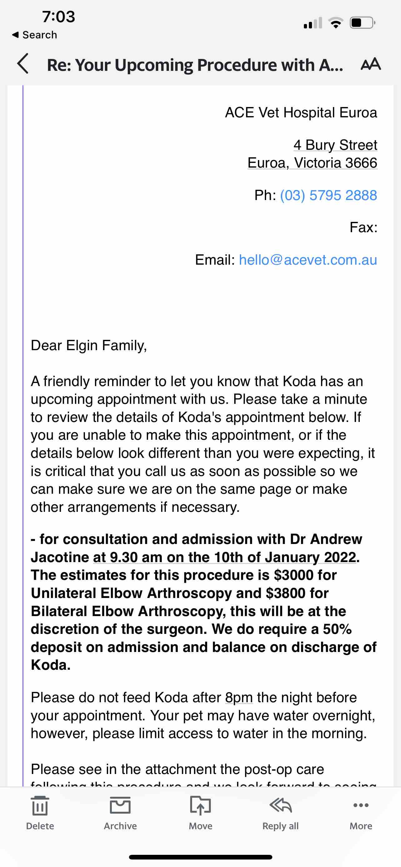 Koda’s vet bill amounts to a total of $3,800. This is my goal for this go fund me. I have attached below the email confirming the price for this required surgery, which he is booked in to have Thirsday