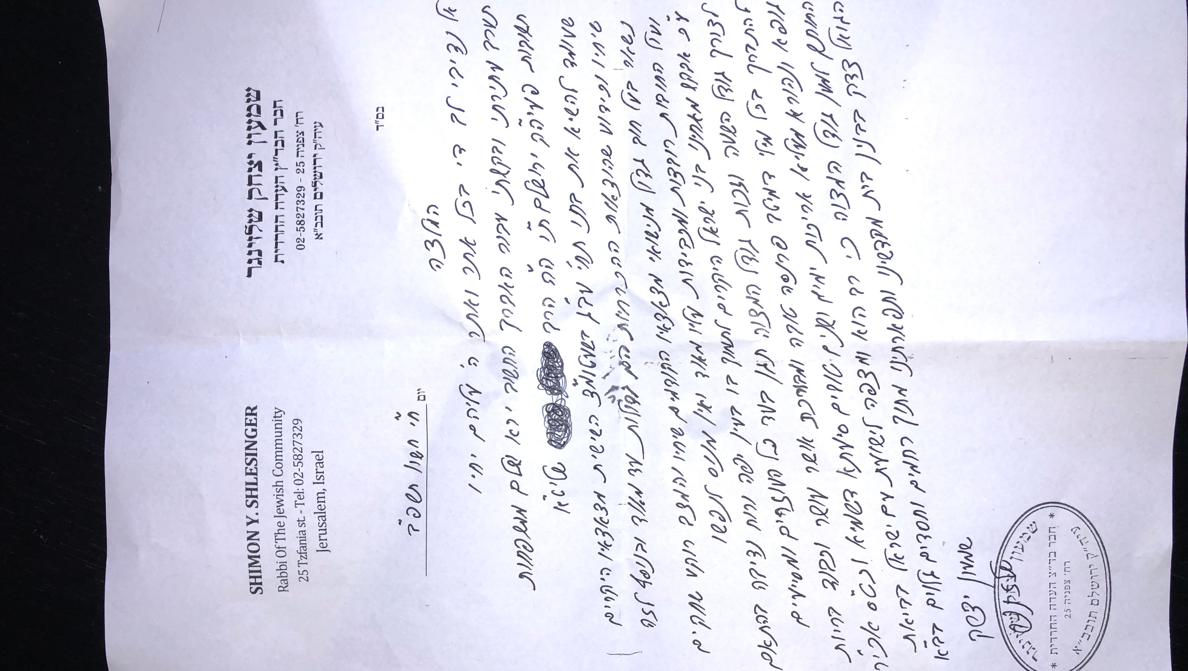 This campaign is verified by R’ Shimon Yitzchak Schlesinger who is a respected Rav on the Badatz Eidah Hachareidis in Yerushalayim. Attached below is the Rav’s letter and signature to prove the need for tzedaka.