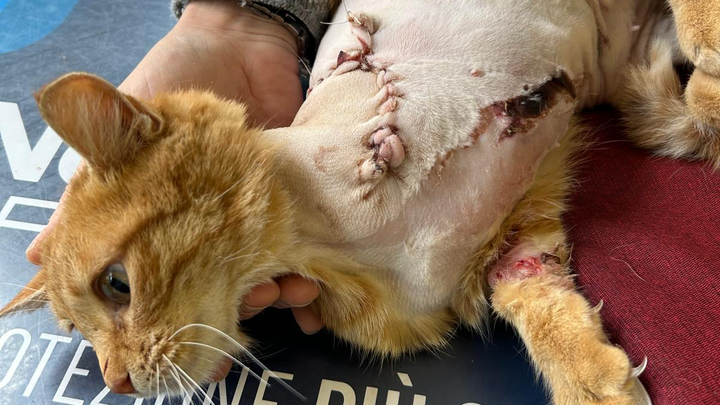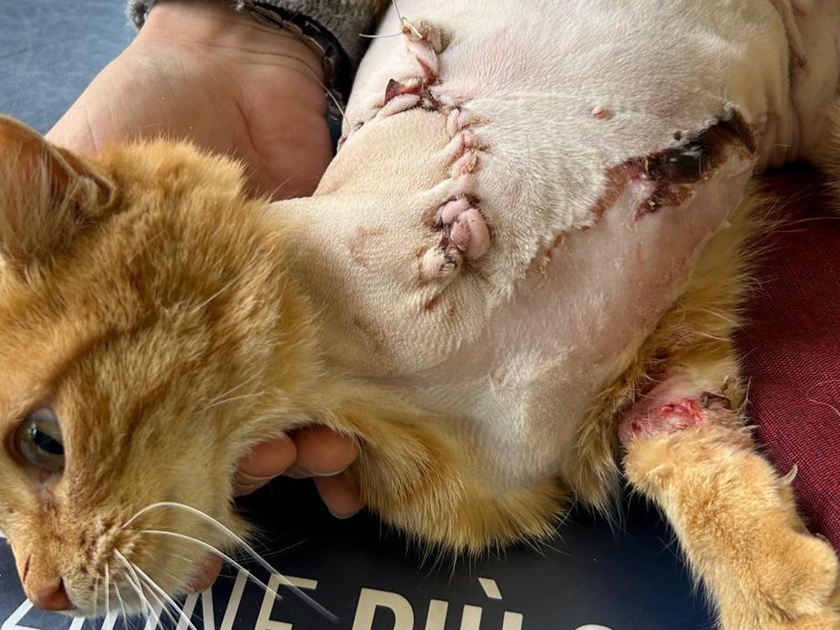 Adesso la micia è ricoverata in ambulatorio, dove le hanno fatto vari esami, hanno medicato le tante altre ferite trovate, e hanno fatto un secondo intervento per finalizzare l'amputazione.