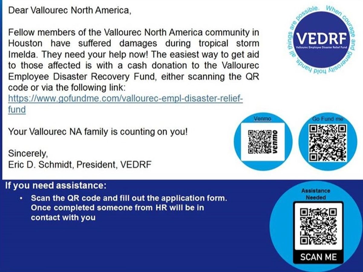 Fellow members of the Vallourec North America community in Houston have suffered catastrophic damages during the ongoing flooding event from Tropical Storm Imelda. They need your help now! The easiest way to get aid to those affected is with a cash donation to the Vallourec Employee Disaster Recovery Fund, via the following link: