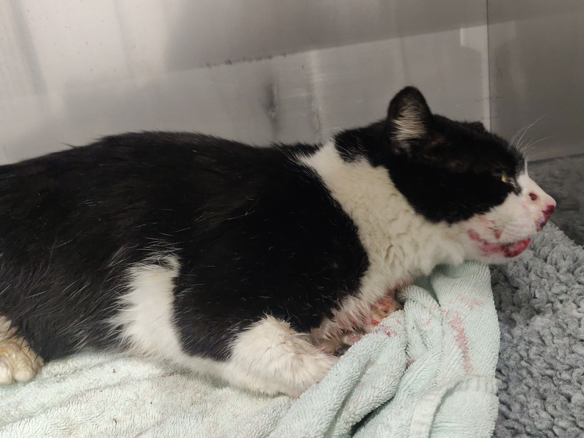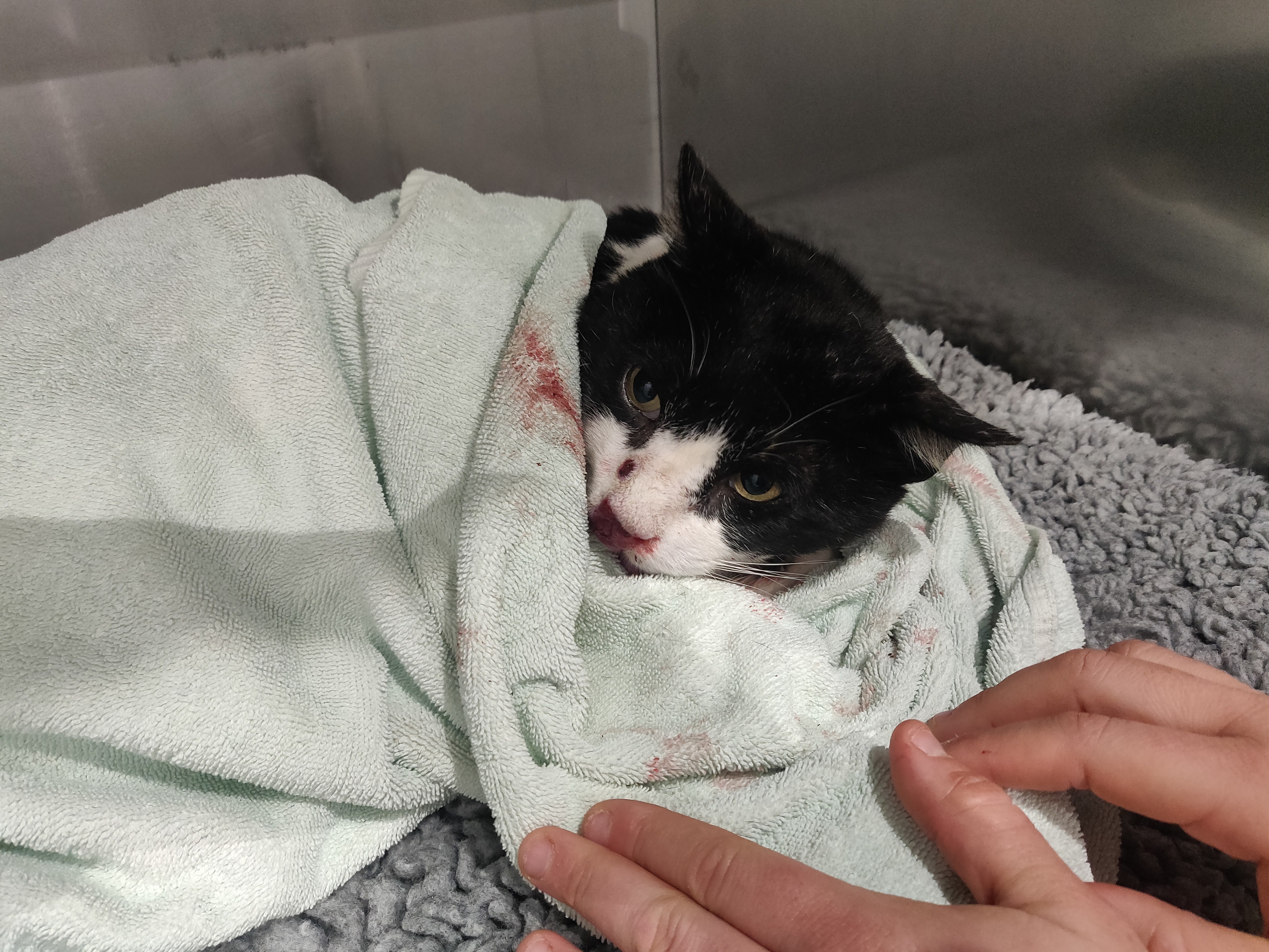 Ao espreitar para debaixo de um carro, encontramos um gato prostrado e muito encolhido, com o focinho ferido e manchado de sangue. O som quase imperceptível que ouvíramos era um miado, enfraquecido e obstruído pelos coágulos.