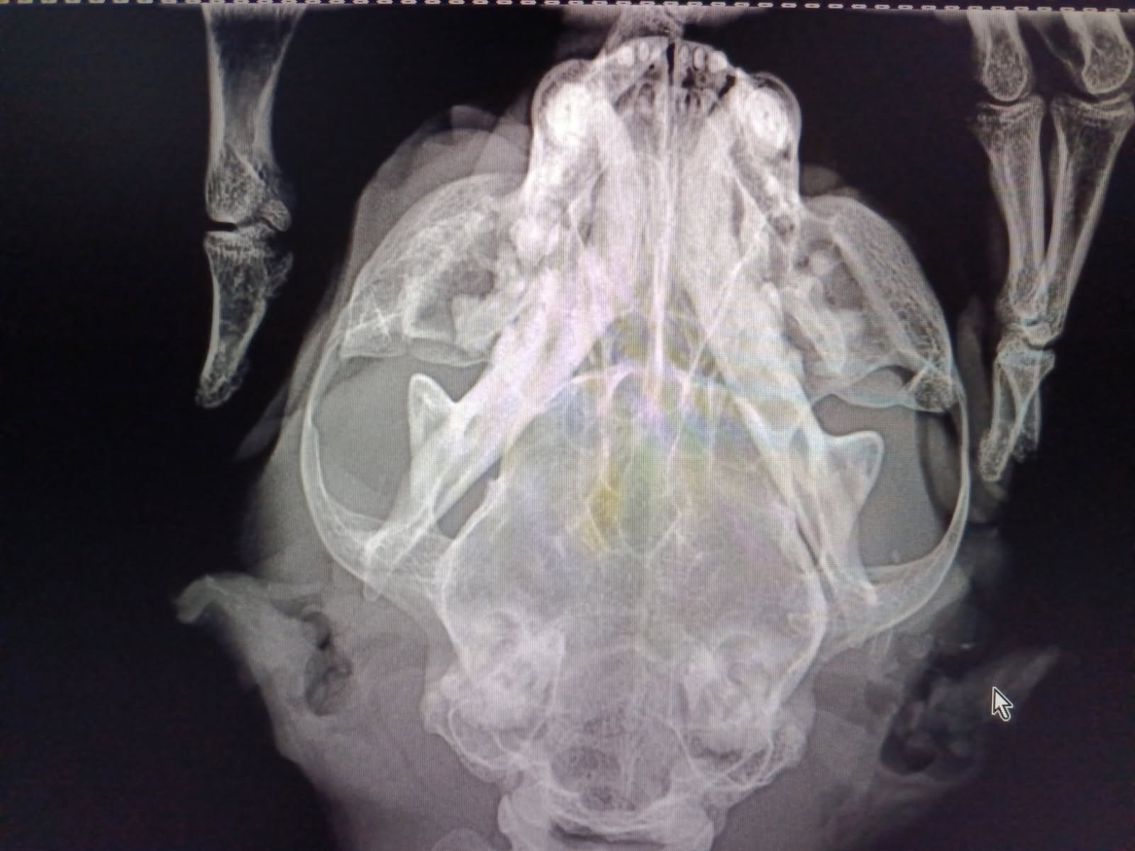 Para já, o Oreo não pode regressar à rua: sofreu um traumatismo que lhe fracturou ambos os maxilares. No raio X pode ter-se, do lado esquerdo, uma factura do ramo da mandíbula.