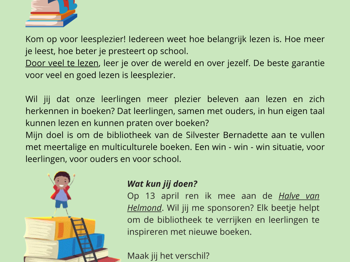 Mijn doel is om de bibliotheek van basisschool Silvester Bernadette te verrijken met meertalige en multiculturele boeken. Dit is een win - win situatie voor onze leerlingen en voor hun ouder, omdat ze samen kunnen lezen en kunnen praten over boeken.