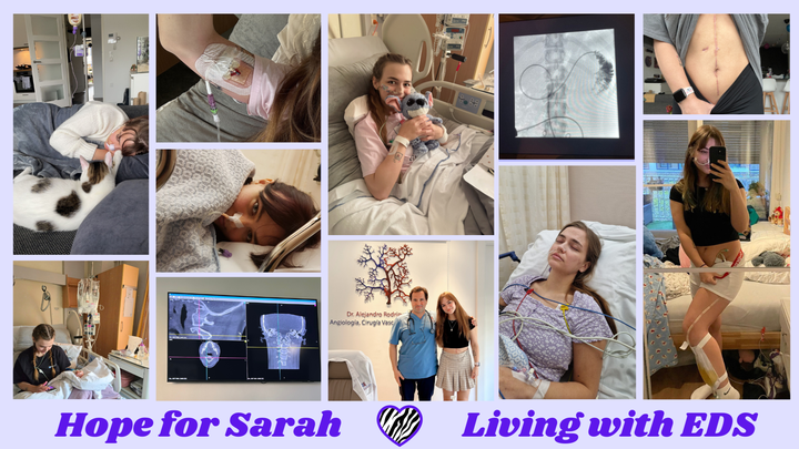 In September of 2022 doctors have diagnosed her with Hypermobile Ehlers Danlos Syndrome, a rare genetic connective tissue disorder. In Sarah’s case, hEDS has resulted in vascular compressions. These compressions have been diagnosed in Germany, Spain and in the Netherlands. Due to these vascular compressions, she is required to be tube fed through a tube in her stomach going to her intestines. The other symptoms of her compression are partial paralysis of her left leg, dangerously low blood pressure, chronic headaches, heart arrythmia, severe abdominal pain, extreme pelvic congestion and more. These vascular compressions are life-limiting disorders without treatment.