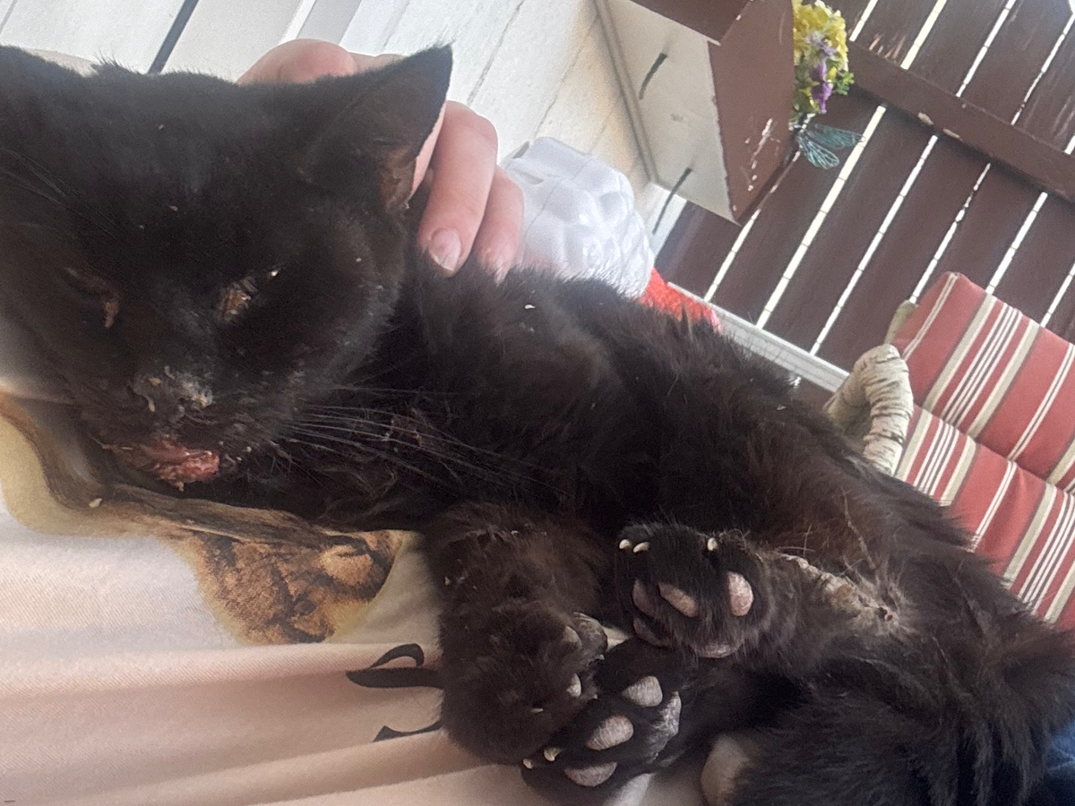 I brought her in and gave her a bath. She drank the smallest bit of milk and is now sleeping. Her paw pads are horribly swollen, she is malnourished, and her jaw/mouth is super sore as well as bleeding.