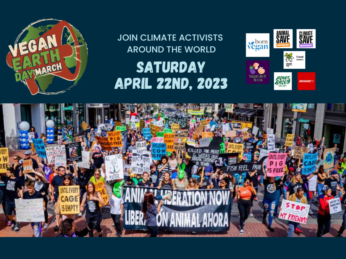 On Earth Day, Saturday, April 22, 2023, we will march and rally in cities all over the world to demand a societal vegan paradigm shift that normalizes non-violence, sustainability, and collective liberation for all earthlings through the immediate development and transition to a plant-based veganic food system. Help us make everyday vegan earth day by supporting the first annual International Vegan Earth Day March!