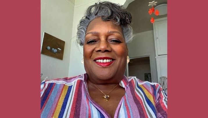 In the center, a black and white photo of Dr. Marcia Canton smiling at the camera with her left pointer finger on her cheek and the rest under her chin.  She has long, black, curly hair, and is wearing a long-sleeved top, a large necklace, and lipstick.