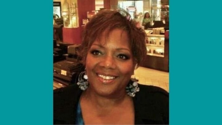 Image Description: Blue banners on either side of the photo. Vera is in a mall, smiling and looking towards the left. She has a short, straight, and brown hairdo, neutral-colored lip gloss, and is wearing a black cardigan over a blue shirt with multilayered white and blue beaded hoop earrings.