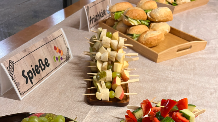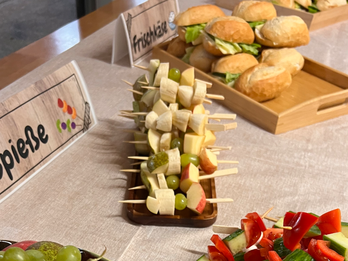 Viele unserer Schüler:innen kommen ohne Frühstück und Vesper in die Schule und wir wollen für diese Schüler:innen ein gutes Angebot schaffen. Es gibt Käsebrötchen, Gemüse- und Obstspieße und frisches Obst.