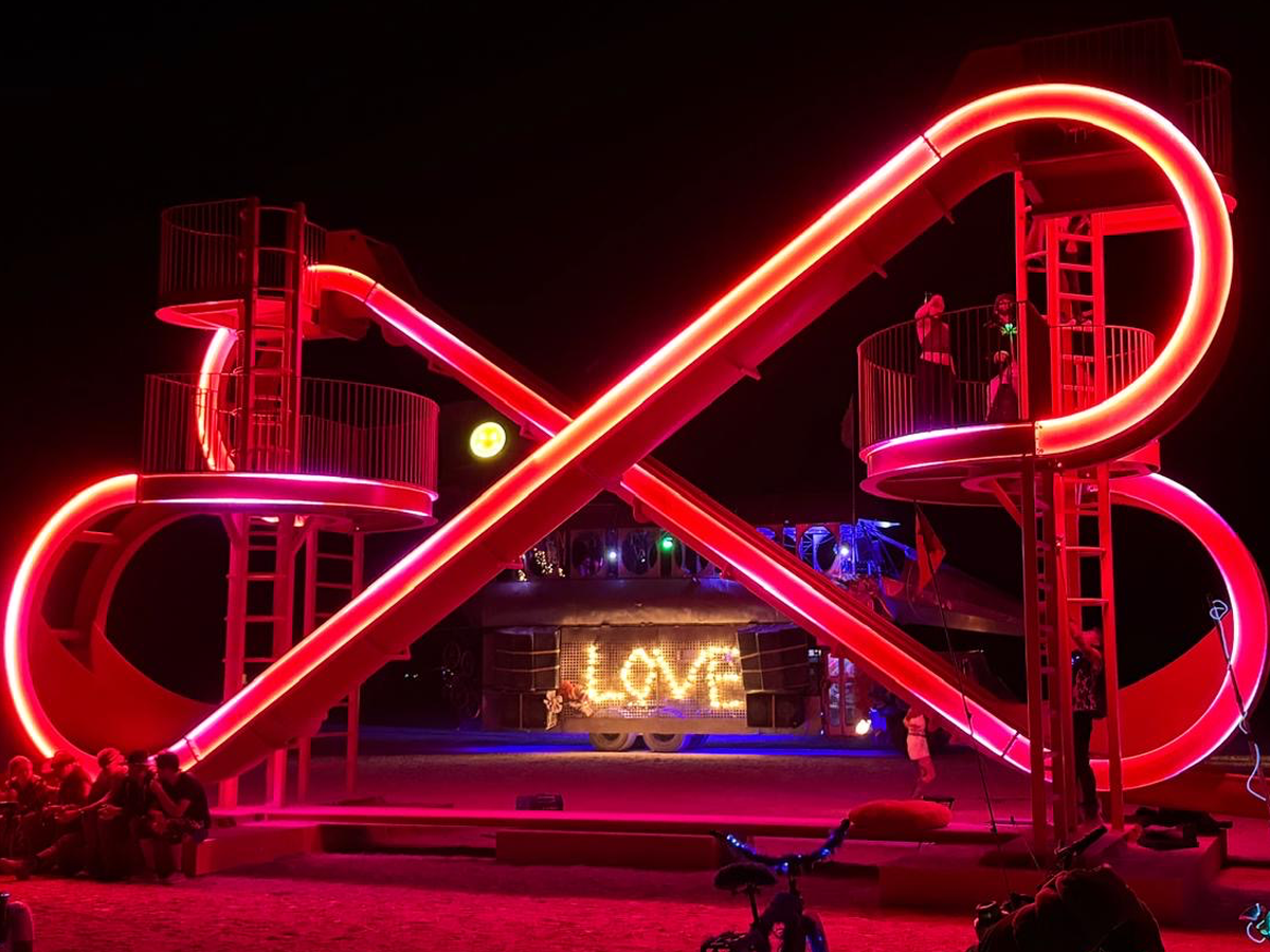 Standing 6.5 meters high and spanning 14 meters long, this breathtaking double slide structure will be shaped as an infinity heart symbol, radiating love and positivity throughout the desert. At its core, this piece is designed to foster joy, playfulness, and communal engagement, inviting everyone to experience the thrill of sliding down into a space of shared happiness and connection.