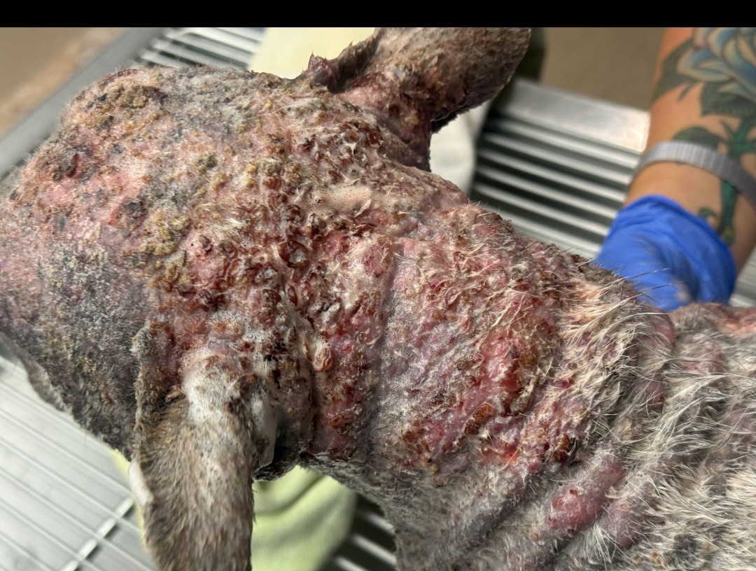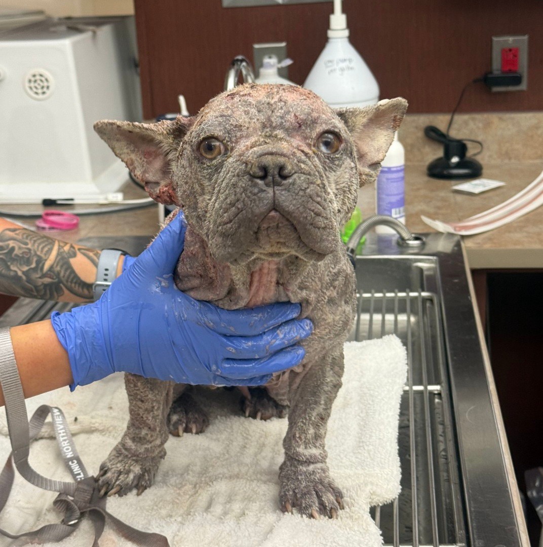 Hello this is 3 year old Ivy. Ivy is a French Bulldog who really needs our help. She was a owner surrender to the rescue in hope that we could help figure out all her skin issues. Her previous owners have tried working with their local Vet to solve Ivy's skin issues to no avail. We agreed to take her in to see our Veterinarian and do what is best for her. Despite all the sores on her body she is just the sweetest girl who loves to give kisses and be snuggled. We have started 2 different antibiotics and steroids in hopes that we will make her comfortable until she can see the dermatology doctor. Please Please Help us help Ivy.