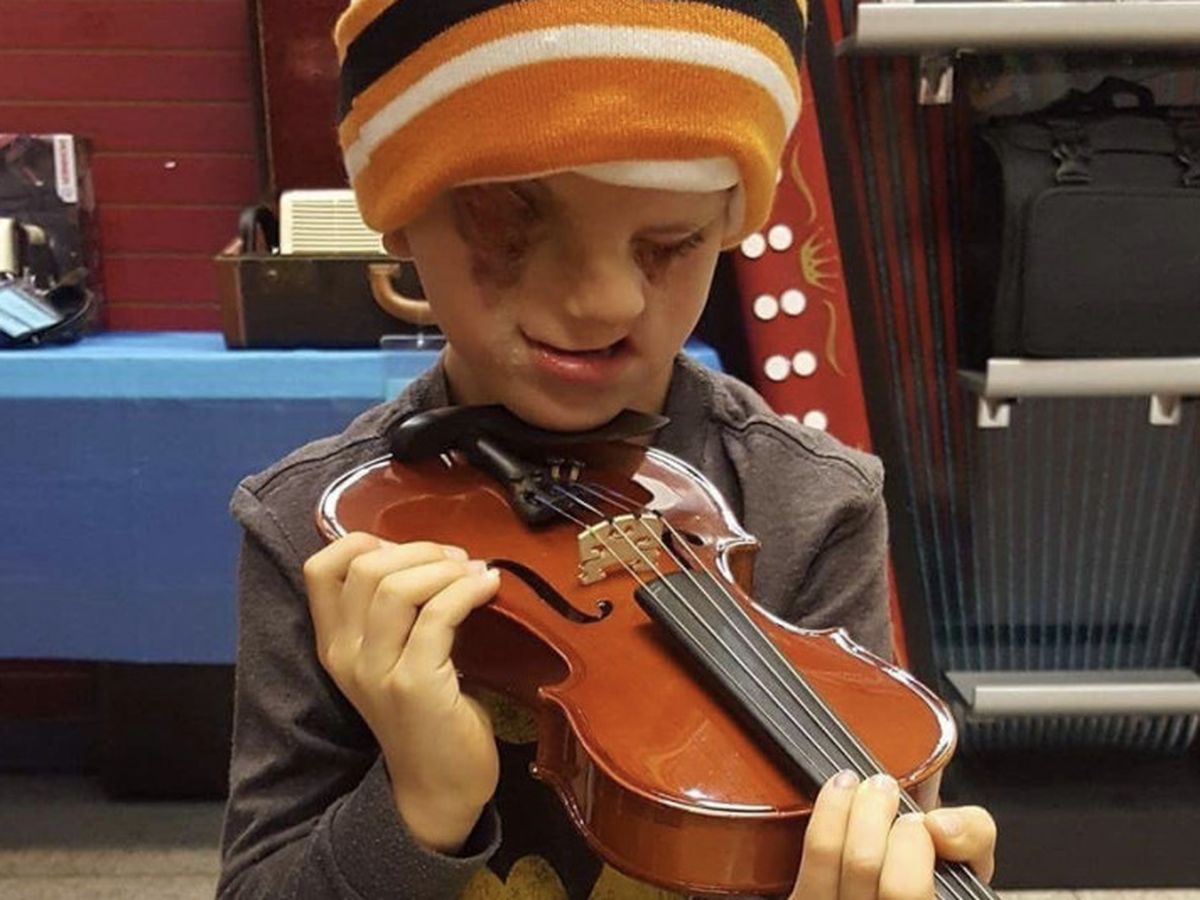 So I'd love if we could pull together and help out this amazing little family, by helping to get Christian his very own violin as well as a year's worth of lessons! Pictured is Christian holding a violin when we had him measured. We need to know what size of violin he would need. He was so excited!
