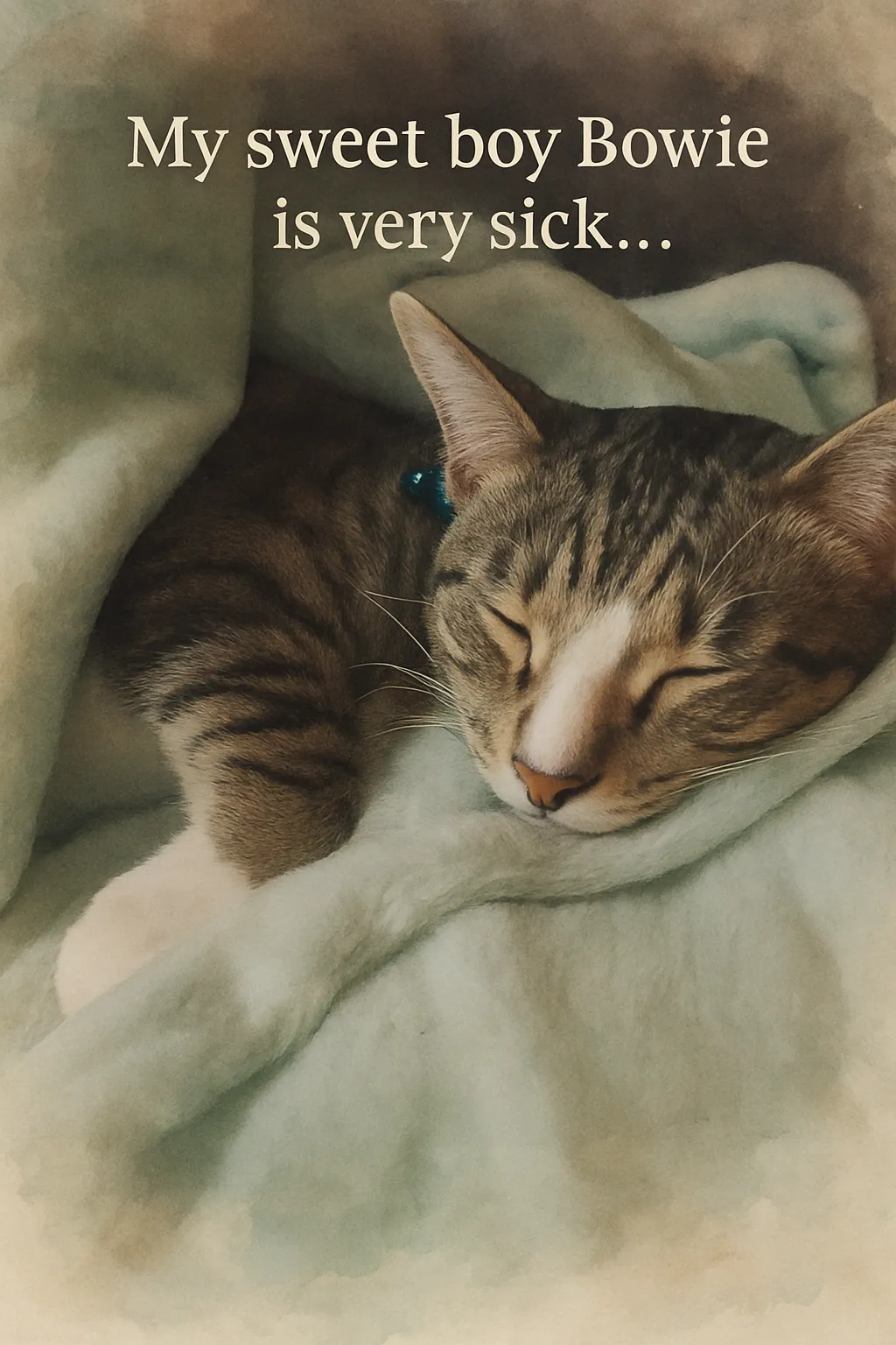 My sweet boy Bowie was rushed to the emergency vet last night for severe respiratory distress. He is currently hospitalized on oxygen with suspected heart failure, fluid around his lungs, and an enlarged heart on X-ray. He is stable but not improving, and the vets are urgently consulting a specialist.