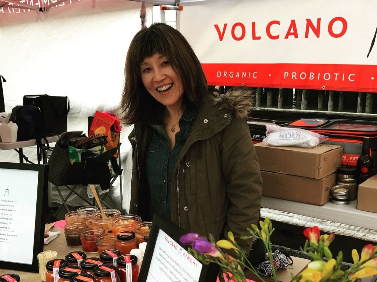 About Volcano Kimchi. We're a small, woman-owned business producing a variety of organic, vegan kimchi and other Korean-inspired fermented food products. We were born in San Francisco, the brainchild of founder and "fermentress" Aruna Lee, who arrived in San Francisco after more than a decade spent as an ordained Buddhist nun in her native South Korea. Looking to recreate the nuanced flavors that are the hallmark of Korea's temple cuisine , she launched Volcano Kimchi in 2015. After a few trial runs she brought her first batch to San Francisco's Rainbow Grocery, and the rest, as they say, is history.