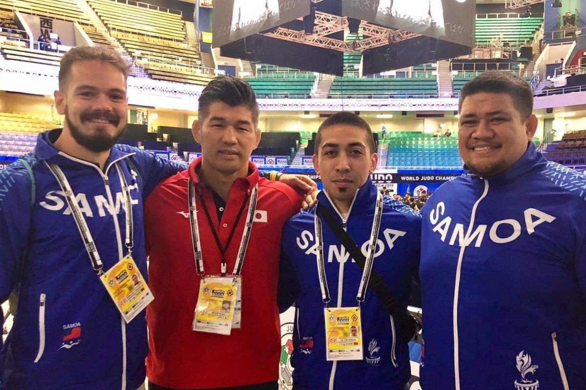 (Team Samoa at the Judo World Championships in Tokyo, August 2019, with the legendary Japanese Judo player and coach Kosei Inoue)"
