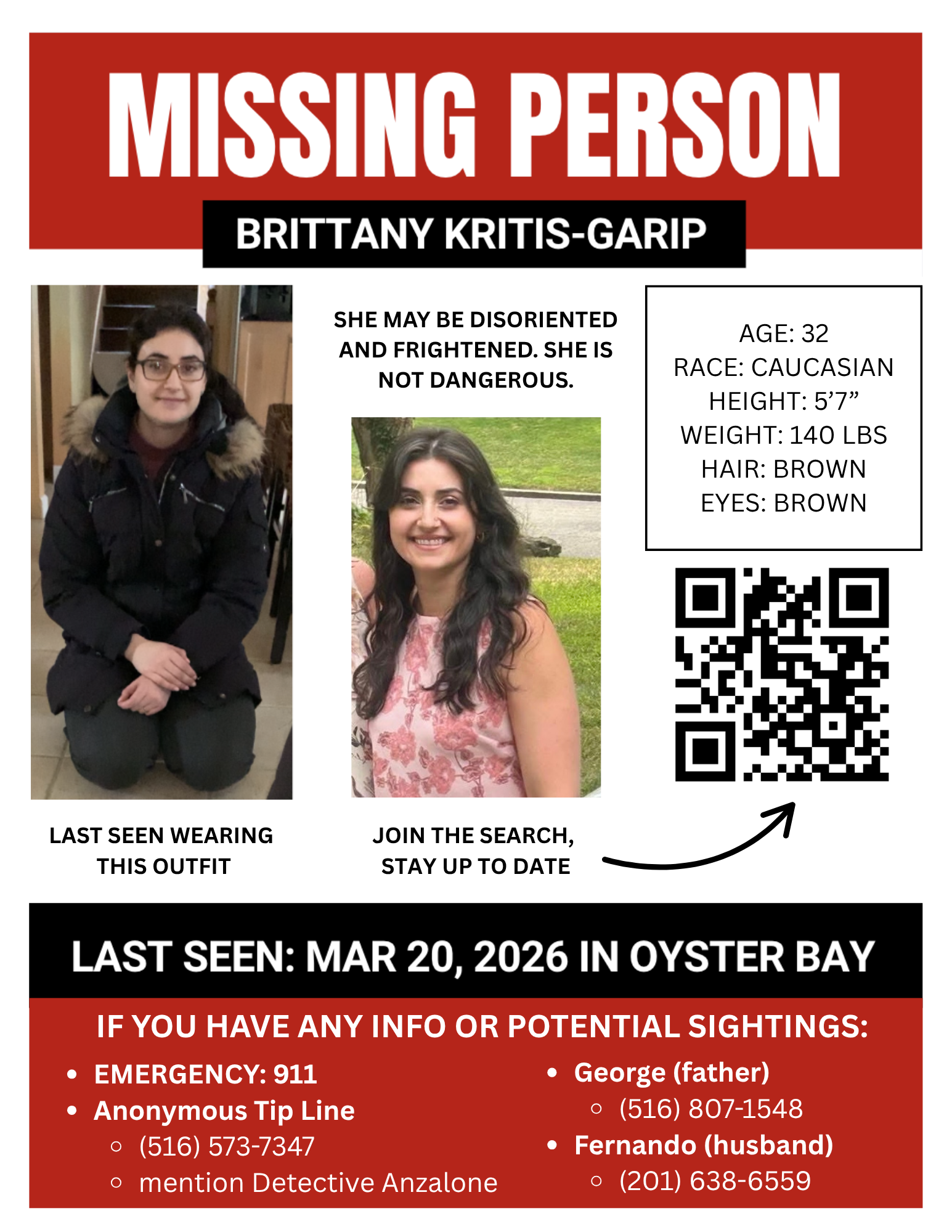 Brittany Kritis-Garip (32) has been missing since Friday, March 20th around 8:00 PM in Oyster Bay, NY.