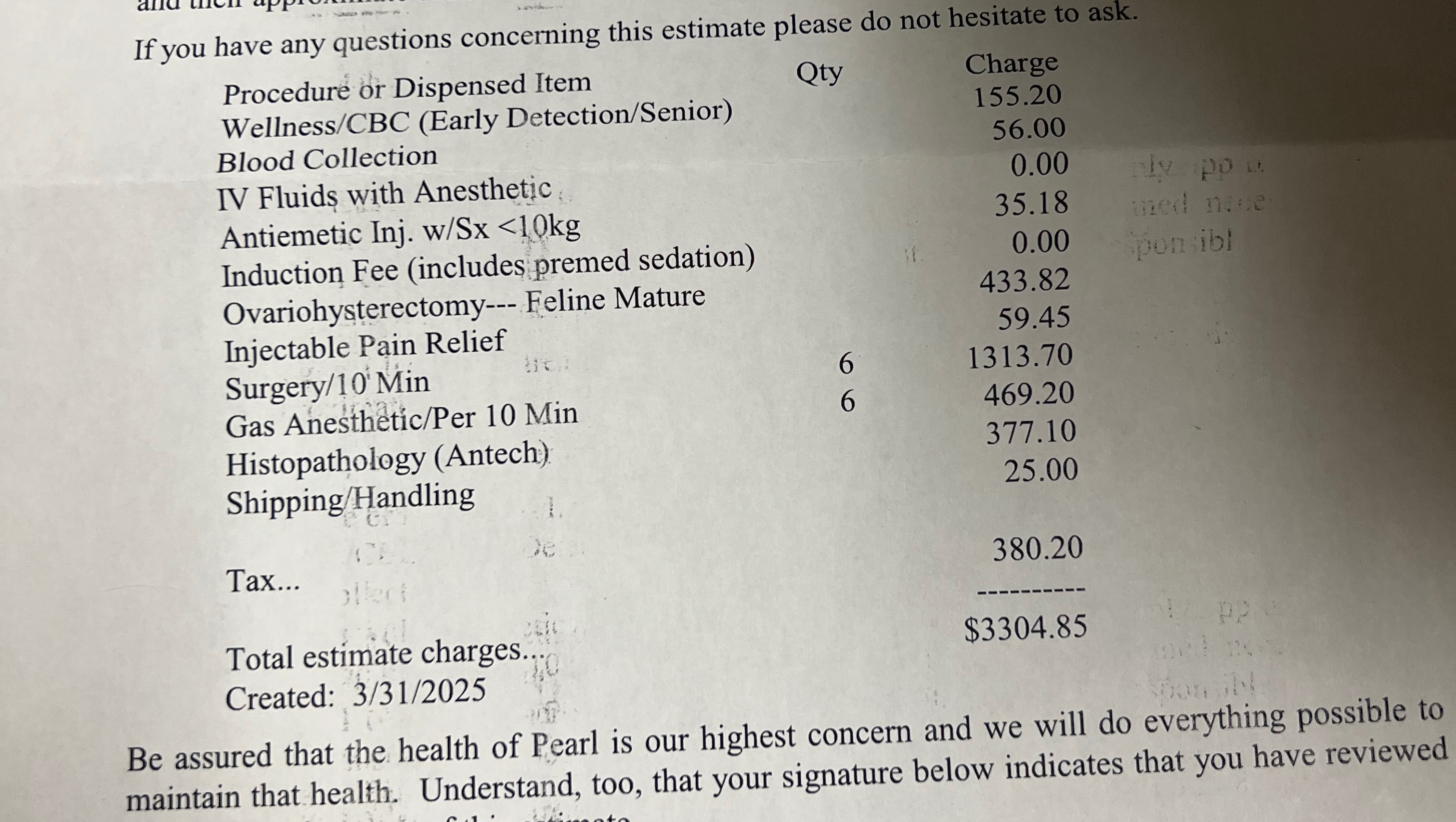 Price Breakdown from Uxbridge Vet Hospital: $3,304.85