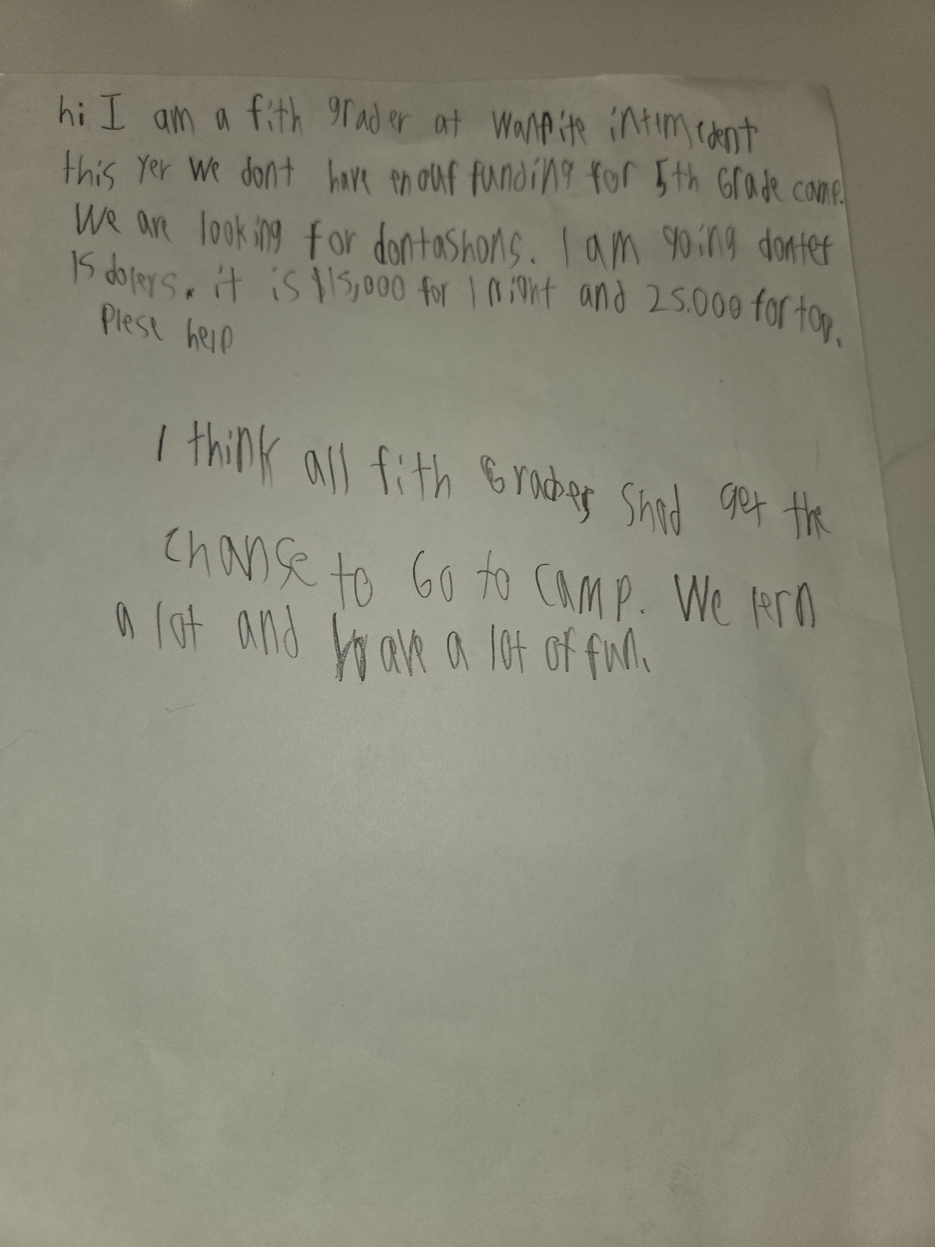 "Hi, I am a fifth grader at Wainwright Intermediate. This year, we don't have enough funding for 5th Grade Camp. I think all fifth graders should get the chance to go to camp. We learn a lot and have a lot of fun. We are looking for donations. I am going to donate $15 dollars. We are looking to raise $12,000. Please help!" - Wainwright Fifth Grade Student