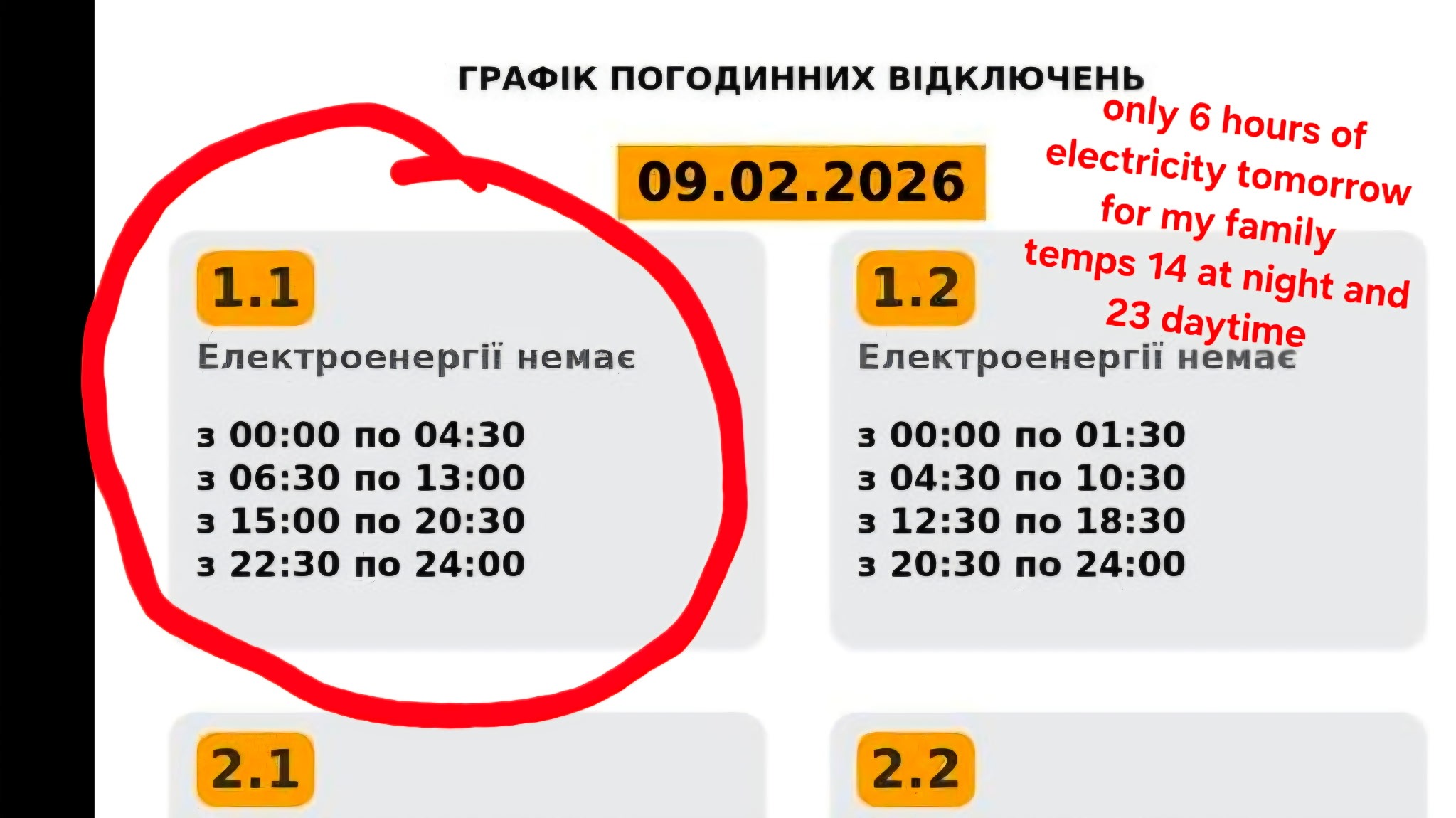 Tonight and tomorrow Julia will have only 6 out of 24 hours of electricity, light and heat.